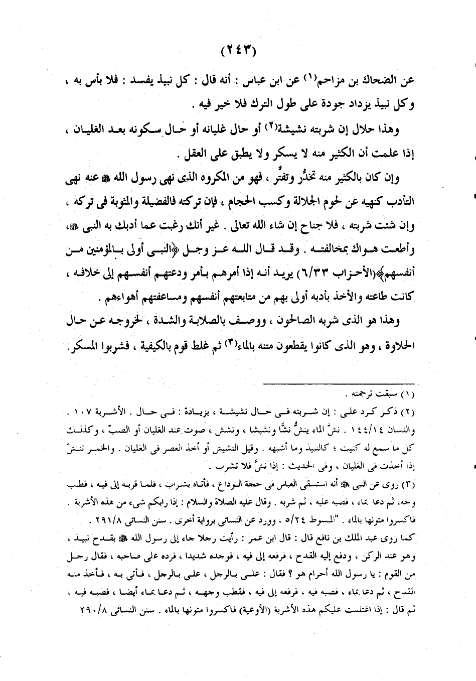 وَكُلُّ نَبِيذٍ يَزْدَادُ جَوْدَةً عَلَى طُولِ التَّرْكِ فَلَا خَيْرَ فِيهِ. وَهَذَا حَلَالٌ إِنْ شَرِبْتَهُ فِي حَالِ نَشِيشِهِ أَوْ حَالِ غَلَيَانِهِ، أَوْ حَالِ سُكُونِهِ بَعْدَ الْغَلَيَانِ، إِذَا عَلِمْتَ أَنَّ الْكَثِيرَ مِنْهُ لَا يُسْكِرُ وَلَا يُطْبِقُ عَلَى الْعَقْلِ. وَإِنْ كَانَ بِالْكَثِيرِ مِنْهُ تَخَدُّرٌ وَتَفَتُّرٌ فَهُوَ مِنَ الْمَكْرُوهِ الَّذِي نَهَى رسول الله) عَنْهُ نَهْيَ التَّأْدِيبِ كَنَهْيِهِ عَنْ لُحُومِ الْجَلَّالَةِ وَكَسْبِ الْحَجَّامِ، فإنَّ أَنْتَ تَرَكْتَهُ فَالْفَضِيلَةُ وَالْمَثُوبَةُ فِي تَرْكِهِ، وَإِنْ أَنْتَ شَرِبْتَهُ فَلَا جناح أن إِنْ شَاءَ اللَّهُ تَعَالَى، غَيْرَ أَنَّكَ رَغِبْتَ عَمَّا أَدَّبَكَ بِهِ النَّبِيَّ صَلَّى اللَّهُ عَلَيْهِ وَسَلَّمَ، وَأَطَعْتَ هَوَاكَ بِمُخَالَفَتِهِ. وَقَدْ قَالَ اللَّهُ عَزَّ وَجَلَّ:) النَّبِيُّ أَوْلَى بالمؤمنين من أنفسهم (يُرِيدُ أَنَّهُ إِذَا أَمَرَهُمْ بِأَمْرٍ وَدَعَتْهُمْ أَنْفُسُهُمْ إِلَى خِلَافِهِ، كَانَتْ طَاعَتُهُ وَالْأَخْذُ بَأَدَبِهِ أَوْلَى بِهِمْ مِنْ مُتَابَعَتِهِمْ أَنْفَسَهُمْ وَمُسَاعَفَتِهِمْ أَهْوَاءَهُمْ، وَهَذَا هُوَ الَّذِي شَرِبَهُ الصَّالِحُونَ وَوُصِفَ بِالصَّلَابَةِ وَالشِّدَّةِ لِخُرُوجِهِ مِنْ حَالِ الْحَلَاوَةِ، وَهُوَ الَّذِي كَانُوا يَقْطَعُونَ مَتْنَهُ بِالْمَاءِ، ثُمَّ غَلَطَ قوم بالكيفية فشربوا المسكر،