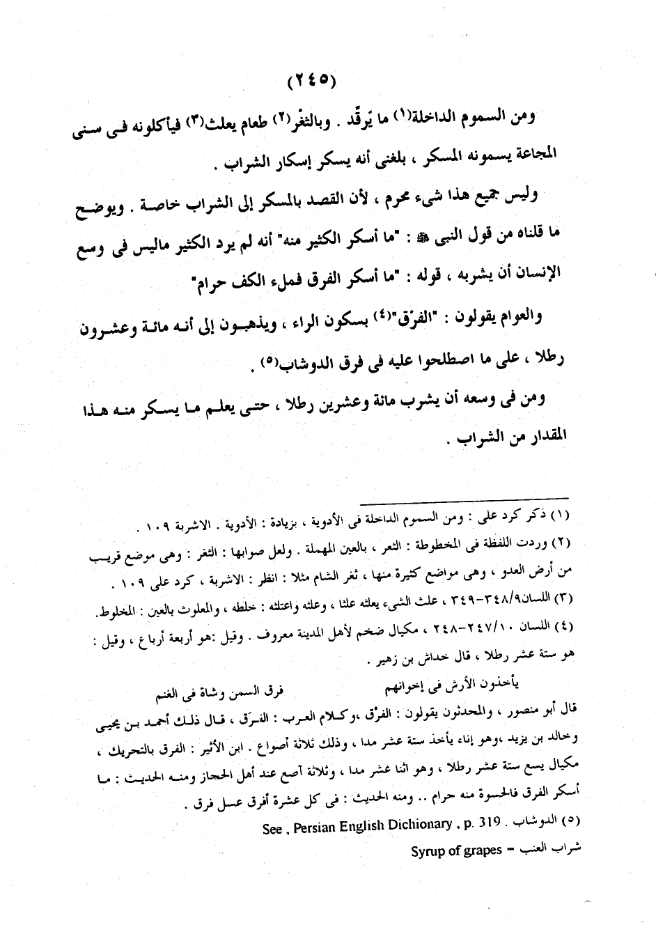 وَمِنَ السُّمُومِ الدَّاخِلَةِ فِي الْأَدْوِيَةِ ما يرقد وبالثغر طعام يلعث فَيَأْكُلُونَهُ فِي سِنِيِّ الْمَجَاعَةِ يُسَمُّونَهُ الْمُسْكِرَ بَلَغَنِي أَنَّهُ يُسْكِرُ إِسْكَارَ الشراب. وليس جميع ذلك بشيء محرم لأنَّ القصد يالمسكر إِلَى الشَّرَابِ خَاصَّةً، وَيُوَضِحُ مَا قُلْنَاهُ مِنْ قَوْلِ النَّبِيِّ صَلَّى اللَّهُ عَلَيْهِ وَسَلَّمَ مَا أَسْكَرَ الْكَثِيرُ مِنْهُ أَنَّهُ لَمْ يُرِدِ الْكَثِيرَ مَا لَيْسَ فِي وُسْعِ الْإِنْسَانِ أَنْ يَشْرَبَهُ قَوْلُهُ مَا أسْكَرَ الْفَرَقُ مِنْهُ فَمِلْءُ الْكَفِّ حَرَامٌ. وَالْعَوَامُّ يَقُولُونَ الَفَرْقُ بِسُكُونِ الرَّاءِ، وَيَذْهَبُونَ إِلَى أَنَّهُ مِائَةٌ وَعِشْرُونَ رَطْلًا عَلَى مَا اصْطَلَحُوا عَلَيْهِ فِي فَرَقِ الدُّوشَابِ وَمَنْ فِي وُسْعِهِ أَنْ يَشْرَبَ مِائَةً وَعِشْرِينَ رَطْلًا حَتَّى يَعْلَمَ مَا يسكر منه ذلك المقدار من الشراب