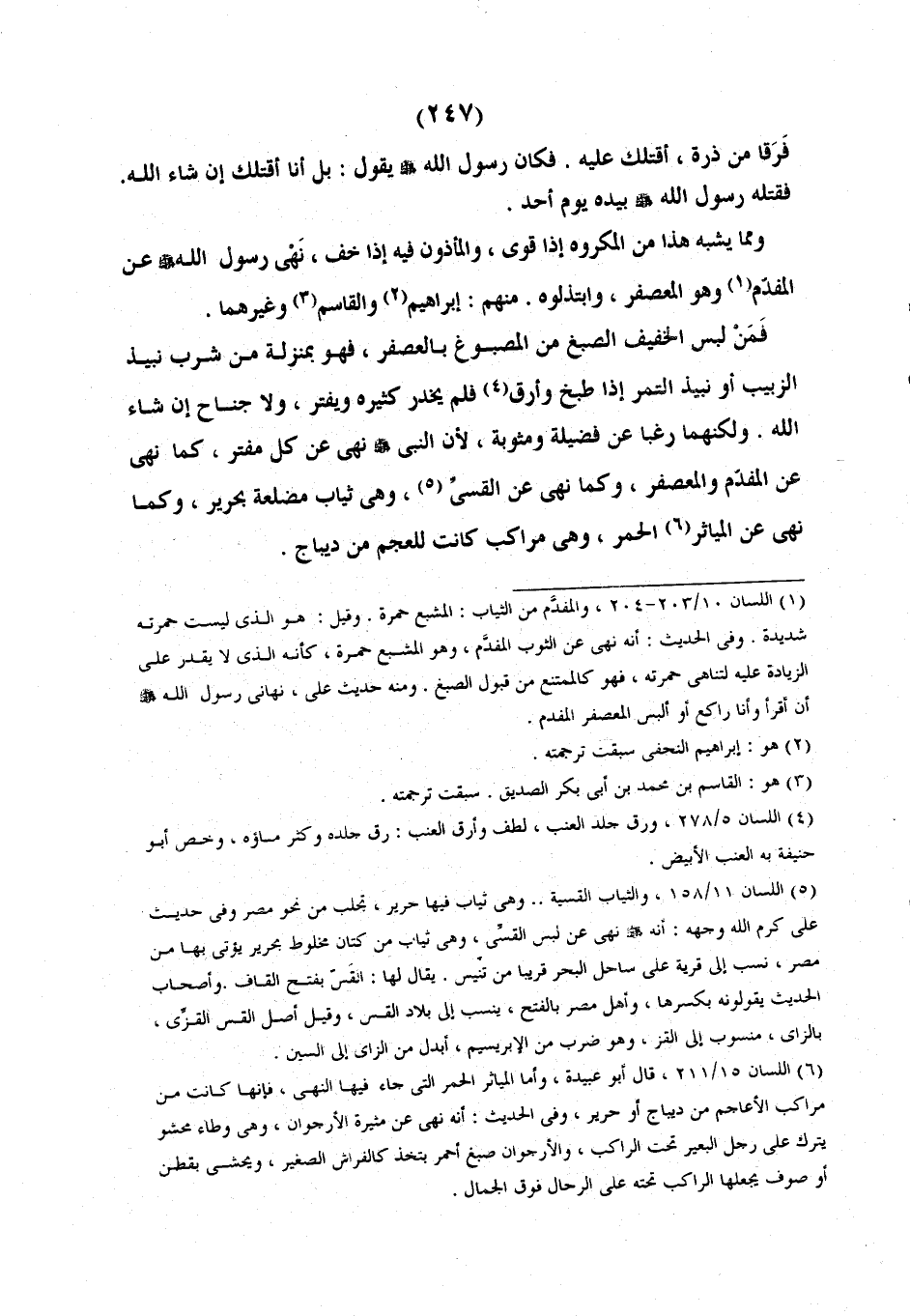 ومما يُشْبِهُ هَذَا مِنَ الْمَكْرُوهِ إِذَا قَوِيَ وَالْمَأْذُونِ فِيهِ إِذَا خَفَّ نهي رسول الله عَنِ الْمُفْدَمِ وَهُوَ الْمُعَصْفَرُ الْمُشْبَعُ وَآذْنُهُ فِيمَا خَفَّ صِبْغُهُ مِنْ ذَلِكَ الْمَصْبُوغِ بِالزَّعْفَرَانِ. فَكَانَ النَّبِيُّ صَلَّى اللَّهُ عَلَيْهِ وَآلِهِ وَسَلَّمَ يَلْبَسُ مَا خَفَّ صَبْغُهُ وَلَبِسَ النَّاسُ الْمُعَصْفَرَ وَابْتَذَلُوهُ مِنْهُمْ إِبْرَاهِيمُ وَالْقَاسِمُ وَغَيْرُهُمَا.