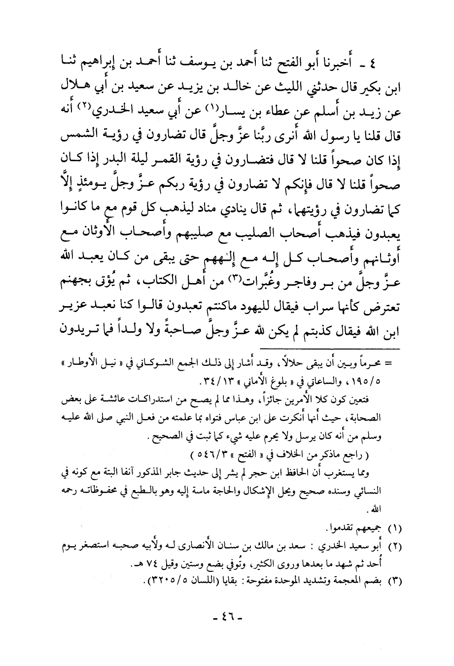 ٤ - أَخْبَرَنَا أَبُو الْفَتْحِ، ثنا أَحْمَدُ بْنُ يُوسُفَ، ثنا أَحْمَدُ بْنُ إِبْرَاهِيمَ، ثنا ابْنُ بُكَيْرٍ، قَالَ: حَدَّثَنِي اللَّيْثُ، عَنْ خَالِدِ بْنِ يَزِيدَ، عَنْ سَعِيدِ بْنِ أَبِي هِلَالٍ، عَنْ زَيْدِ بْنِ أَسْلَمَ، عَنْ عَطَاءِ بْنِ يَسَارٍ، عَنْ أَبِي سَعِيدٍ الْخُدْرِيِّ أَنَّهُ قَالَ: قُلْنَا: يَا رَسُولَ اللَّهِ، أَنَرَى رَبَّنَا عَزَّ وَجَلَّ؟ قَالَ: «تُضَارُّونَ فِي رُؤْيَةِ الشَّمْسِ إِذَا كَانَتْ صَحْوًا؟» قُلْنَا: لَا. قَالَ: «فَتُضَارُّونَ فِي رُؤْيَةِ الْقَمَرِ لَيْلَةَ الْبَدْرِ إِذَا كَانَ صَحْوًا؟» قُلْنَا: لَا. قَالَ: «فَإِنَّكُمْ لَا تُضَارُّونَ فِي رُؤْيَةِ رَبِّكُمْ عَزَّ وَجَلَّ يَوْمَئِذٍ إِلَّا كَمَا تُضَارُّونَ فِي رُؤْيَتِهِمَا» ، ثُمَّ قَالَ: " يُنَادِي مُنَادٍ: لِيَذْهَبْ كُلُّ قَوْمٍ مَعَ مَا كَانُوا يَعْبُدُونَ، فَيَذْهَبُ أَصْحَابُ الصَّلِيبِ مَعَ صَلِيبِهِمْ، وَأَصْحَابُ الْأَوْثَانِ مَعَ أَوْثَانِهِمْ، وَأَصْحَابُ كُلِّ إِلَهٍ مَعَ إِلَهِهِمْ، حَتَّى يَبْقَى مَنْ كَانَ يَعْبُدُ اللَّهَ عَزَّ وَجَلَّ مِنْ بَرٍّ وَفَاجِرٍ، وَغُبَّرَاتٌ مِنْ أَهْلِ الْكِتَابِ، ثُمَّ يُؤْتَى بِجَهَنَّمَ تَعْتَرِضُ كَأَنَّهَا سَرَابٌ، فَيُقَالُ لِلْيَهُودِ: مَا كُنْتُمْ تَعْبُدُونَ؟ قَالُوا: كُنَّا نَعْبُدُ عُزَيْرَ ابْنَ اللَّهِ، فَيُقَالُ كَذَبْتُمْ، لَمْ يَكُنْ لِلَّهِ عَزَّ وَجَلَّ صَاحِبَةٌ وَلَا وَلَدٌ، فَمَا تُرِيدُونَ؟ ⦗٤٧⦘ قَالُوا: نُرِيدُ أَنْ تَسْقِيَنَا، فَيُقَالُ: اشْرَبُوا، فَيَتَسَاقَطُونَ فِي جَهَنَّمَ، ثُمَّ يُقَالُ لِلنَّصَارَى: مَا كُنْتُمْ تَعْبُدُونَ؟ فَيَقُولُونَ: كُنَّا نَعْبُدُ الْمَسِيحَ ابْنَ اللَّهِ، فَيُقَالُ: كَذَبْتُمْ، لَمْ يَكُنْ لِلَّهِ صَاحِبَةٌ وَلَا وَلَدٌ، فَمَا تُرِيدُونَ؟ فَيَقُولُونَ: نُرِيدُ أَنْ تَسْقِيَنَا، فَيُقَالُ: اشْرَبُوا، فَيَتَسَاقَطُونَ حَتَّى يَبْقَى مَنْ كَانَ يَعْبُدُ اللَّهَ عَزَّ وَجَلَّ مِنْ بَرٍّ وَفَاجِرٍ، فَيُقَالُ لَهُمْ: مَا يُجْلِسُكُمْ وَقَدْ ذَهَبَ النَّاسُ؟ فَيَقُولُونَ: قَدْ فَارَقْنَاهُمْ، وَنَحْنُ أَحْوَجُ إِلَيْهِمْ مِنَّا الْيَوْمَ، وَإِنَّا سَمِعْنَا مُنَادِيًا يَقُولُ: لِيَلْحَقْ كُلُّ قَوْمٍ بِمَا كَانُوا يَعْبُدُونَ، وَإِنَّا نَنْتَظِرُ رَبَّنَا، فَيَأْتِيهِمُ الْجَبَّارُ عَزَّ وَجَلَّ فِي صُورَةٍ غَيْرِ صُورَتِهِ الَّتِي رَأَوْهُ فِيهَا أَوَّلَ مَرَّةٍ، فَيَقُولُ: أَنَا رَبُّكُمُ، فَيَقُولُونَ: أَنْتَ رَبُّنَا وَلَا يُكَلِّمُهُ إِلَّا الْأَنْبِيَاءُ، فَيَقُولُ: هَلْ بَيْنَكُمْ وَبَيْنَهُ آيَةٌ تَعْرِفُونَهَا؟ فَيَقُولُونَ: السَّاقُ، فَيَكْشِفُ عَنْ سَاقِهِ، فَيَسْجُدُ كُلُّ مُؤْمِنٍ، وَيَبْقَى مَنْ كَانَ يَسْجُدُ لِلَّهِ رِيَاءً وَسُمْعَةً، فَيَذْهَبُ كَيْمَا يَسْجُدُ، فَيَعُودُ ظَهْرُهُ طَبَقًا وَاحِدًا، ثُمَّ يُؤْتَى بِالْجِسْرِ فَيُجْعَلُ بَيْنَ ظَهْرَيْ جَهَنَّمَ "، قُلْنَا: يَا رَسُولَ اللَّهِ، وَمَا الْجِسْرُ؟ قَالَ: " مَدْحَضَةٌ، مَزِلَّةٌ، عَلَيْهِ خَطَاطِيفُ، وَكَلَالِيبُ، وَحَسَكٌ مُفَلْطَحَةٌ، لَهَا شَوْكَةٌ عُقَيْفَاءُ تَكُونُ بِنَجْدٍ، يُقَالُ لَهَا: السَّعْدَانُ، يَمُرُّ الْمُؤْمِنُ عَلَيْهَا كَالطَّرْفِ، وَكَالْبَرْقِ، وَكَالرِّيَحِ، وَكَأَجَاوِيدِ ⦗٤٨⦘ الْخَيْلِ وَالرِّكَابِ، فَنَاجٍ مُسَلَّمٌ، وَنَاجٍ مَخْدُوشٌ، ثُمَّ مَكْدُوحٌ فِي نَارِ جَهَنَّمَ، حَتَّى يَمُرَّ أَحَدُهُمْ يُسْحَبُ سَحْبًا، فَمَا أَنْتُمْ بِأَشَدَّ مِنَّا شِدَّةً فِي الْحَقِّ، قَدْ تَبَيَّنَ لَكُمْ مِنَ الْمُؤْمِنِينَ يَوْمَئِذٍ لِلْجَبَّارِ عَزَّ وَجَلَّ، إِذَا رَأَوْا أَنَّهُمْ قَدْ نَجَوْا فِي إِخْوَانِهِمْ، يَقُولُونَ: رَبَّنَا، إِخْوَانُنَا كَانُوا يُصَلُّو