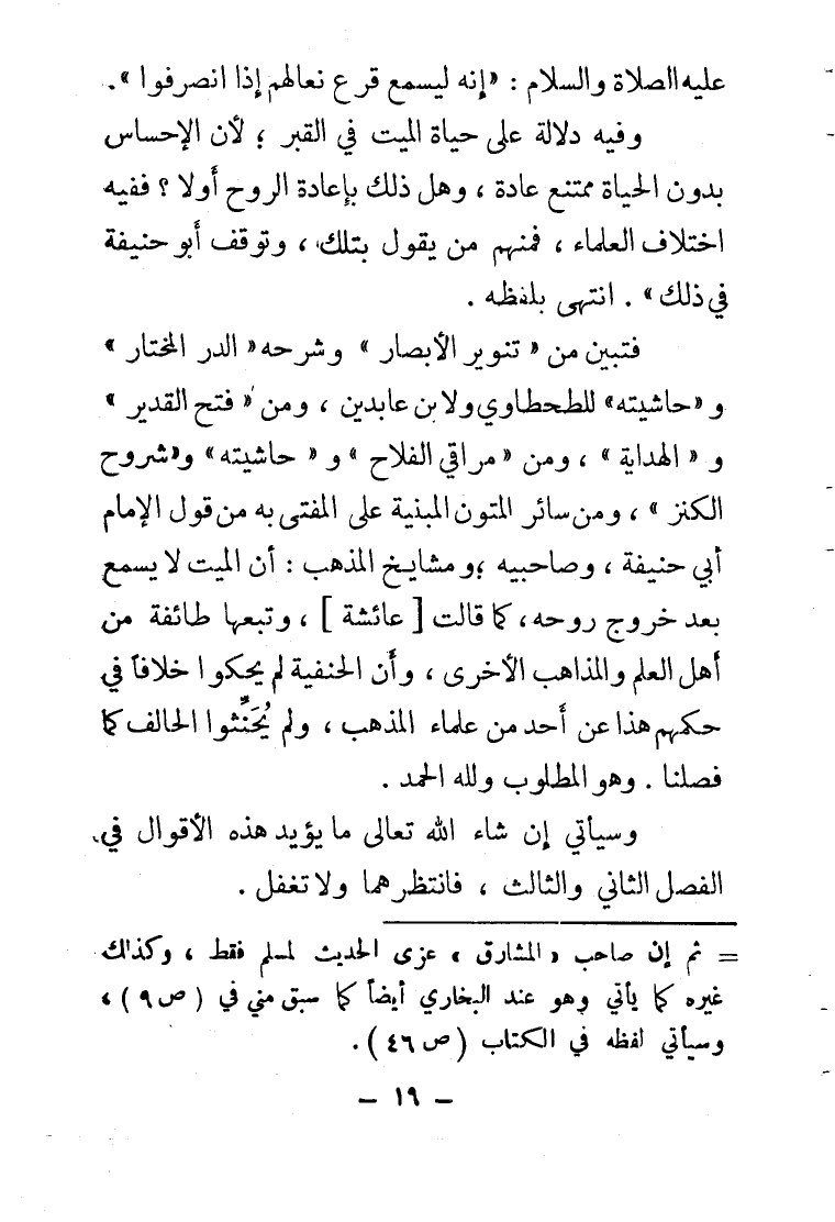 فَتبين من تنوير الْأَبْصَار وَشَرحه الدّرّ الْمُخْتَار وحاشيته للطحطاوي وَلابْن عابدين وَمن فتح الْقَدِير وَالْهِدَايَة وَمن مراقي الْفَلاح وحاشيته وشروح الْكَنْز وَمن سَائِر الْمُتُون المبنية على الْمُفْتِي بِهِ من قَول الإِمَام أبي حنيفَة وصاحبيه ومشايخ الْمَذْهَب أَن الْمَيِّت لَا يسمع بعد خُرُوج روحه كَمَا قَالَت عَائِشَة وتبعها طَائِفَة من أهل الْعلم والمذاهب الْأُخْرَى وَأَن الْحَنَفِيَّة لم يحكوا خلافًا فِي حكمهم هَذَا عَن أحد من عُلَمَاء الْمَذْهَب وَلم يحنثوا الْحَالِف كَمَا فصلنا وَهُوَ الْمَطْلُوب وَللَّه الْحَمد