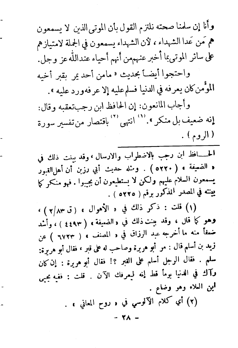 وَأَنا إِن سلمنَا صِحَّته نلتزم القَوْل بِأَن الْمَوْتَى الَّذين لَا يسمعُونَ هم من عدا الشُّهَدَاء لِأَن الشُّهَدَاء يسمعُونَ فِي الْجُمْلَة لامتيازهم على سَائِر الْمَوْتَى بِمَا أخبر عَنْهُم من أَنهم احياء عِنْد الله عز وَجل