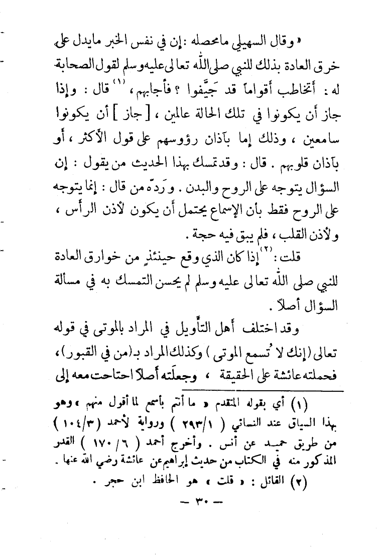 وَقَالَ السُّهيْلي مَا محصله إِن فِي نفس الْخَبَر مَا يدل على خرق الْعَادة بذلك للنَّبِي صلى الله عَلَيْهِ وَسلم لقَوْل الصَّحَابَة لَهُ أتخاطب أَقْوَامًا قد جيفوا فأجابهم قَالَ وَإِذا جَازَ أَن يَكُونُوا فِي تِلْكَ الْحَالة عَالمين جَازَ أَن يَكُونُوا سَامِعين وَذَلِكَ إِمَّا بآذان رؤوسهم على قَول الْأَكْثَر أَو بآذان قُلُوبهم قَالَ وَقد تمسك بِهَذَا الحَدِيث من يَقُول إِن السُّؤَال يتَوَجَّه على الرّوح وَالْبدن ورده من قَالَ إِنَّمَا يتَوَجَّه على الرّوح فَقَط بِأَن الإسماع يحْتَمل أَن يكون لأذن الرَّأْس ولأذن الْقلب فَلم يبْق فِيهِ حجَّة