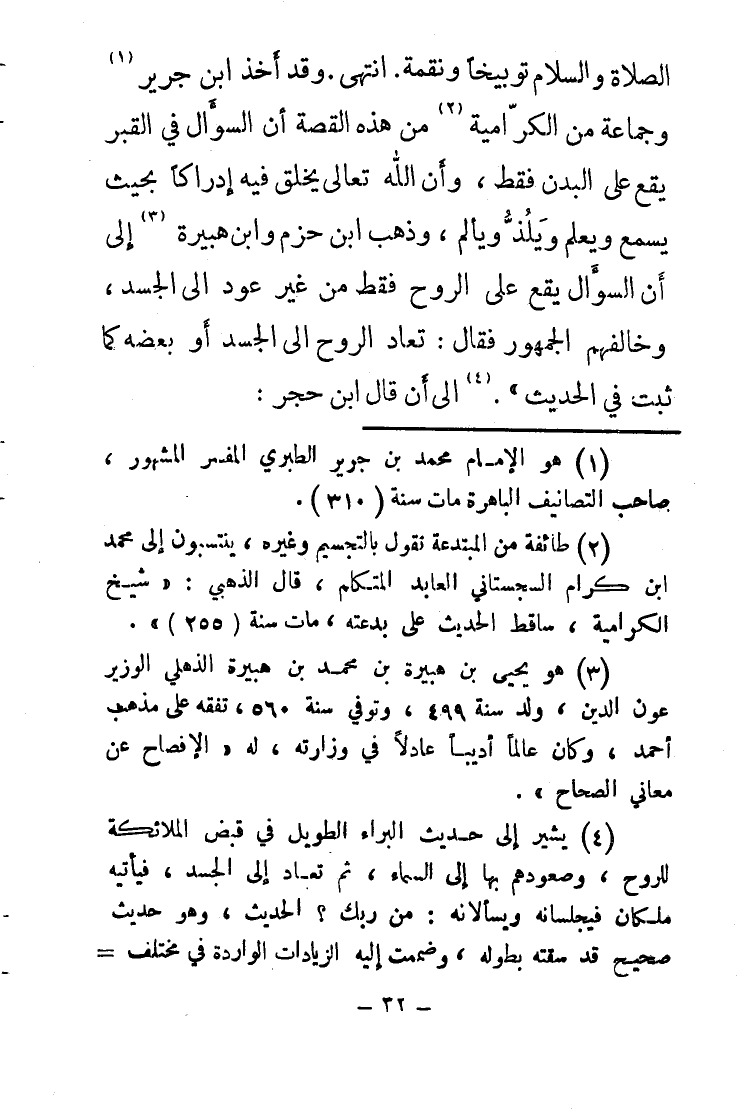 الصَّلَاة وَالسَّلَام توبيخا ونقمة انْتهى وَقد أَخذ ابْن جرير وَجَمَاعَة من الكرامية من هَذِه الْقِصَّة أَن السُّؤَال فِي الْقَبْر يَقع على الْبدن فَقَط وَأَن الله تَعَالَى يخلق فِيهِ إدراكا بِحَيْثُ يسمع وَيعلم ويلذ ويألم وَذهب ابْن حزم وَابْن هُبَيْرَة إِلَى أَن السُّؤَال يَقع على الرّوح فَقَط من غير عود إِلَى الْجَسَد وَخَالفهُم الْجُمْهُور فَقَالَ تُعَاد الرّوح إِلَى الْجَسَد أَو بعضه كَمَا ثَبت فِي الحَدِيث إِلَى أَن قَالَ ابْن حجر