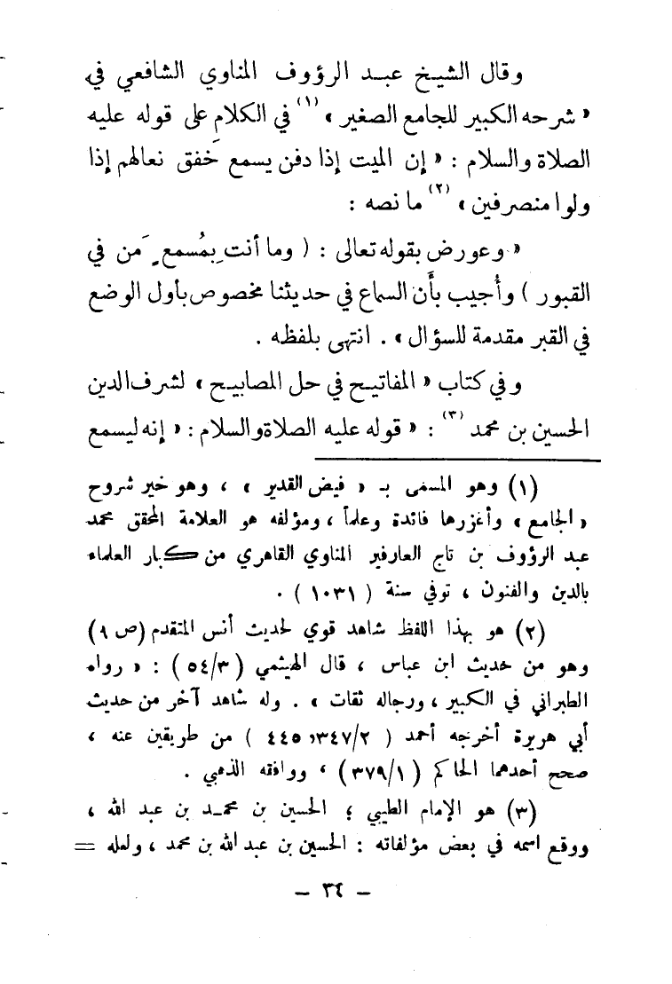 وَقَالَ الشَّيْخ عبد الرؤوف الْمَنَاوِيّ الشَّافِعِي فِي شَرحه الْكَبِير للجامع الصَّغِير فِي الْكَلَام على قَوْله عَلَيْهِ الصَّلَاة وَالسَّلَام إِن الْمَيِّت إِذا دفن يسمع خَفق نعَالهمْ إِذا ولوا منصرفين مَا نَصه