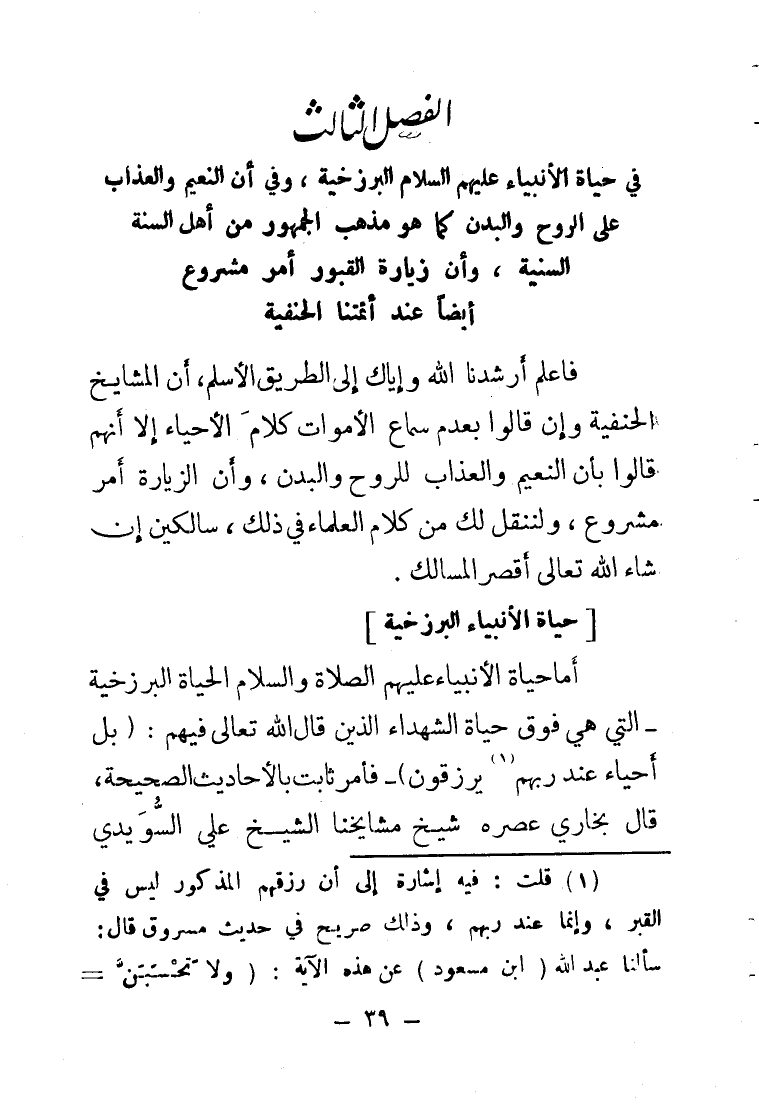 فِي حَيَاة الْأَنْبِيَاء عَلَيْهِم السَّلَام البرزخية وَفِي أَن النَّعيم وَالْعَذَاب على الرّوح وَالْبدن كَمَا هُوَ مَذْهَب الْجُمْهُور من أهل السّنة السّنيَّة وَأَن زِيَارَة الْقُبُور أَمر مَشْرُوع ايضا عِنْد أَئِمَّتنَا الْحَنَفِيَّة