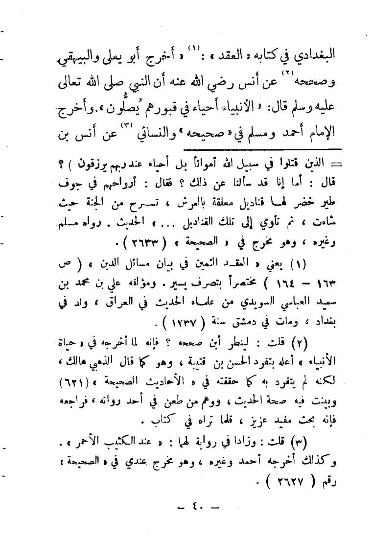 الْبَغْدَادِيّ فِي كِتَابه العقد أخرج أَبُو يعلى وَالْبَيْهَقِيّ وَصَححهُ عَن انس رَضِي الله عَنهُ أَن النَّبِي صلى الله عَلَيْهِ وَسلم قَالَ الْأَنْبِيَاء أَحيَاء فِي قُبُورهم يصلونَ وَأخرج الإِمَام أَحْمد وَمُسلم فِي صَحِيحه وَالنَّسَائِيّ عَن أنس بن
