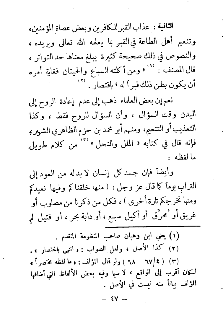 الثَّانِيَة عَذَاب الْقَبْر للْكَافِرِينَ وَبَعض عصاة الْمُؤمنِينَ وتنعيم أهل الطَّاعَة فِي الْقَبْر بِمَا يُعلمهُ الله تَعَالَى ويريده والنصوص فِي ذَلِك صَحِيحَة كَثِيرَة يبلغ مَعْنَاهَا حد التَّوَاتُر قَالَ المُصَنّف وَمن أَكلته السبَاع وَالْحِيتَان فغاية أمره أَن يكون بطن ذَلِك قبرا لَهُ باقتصار