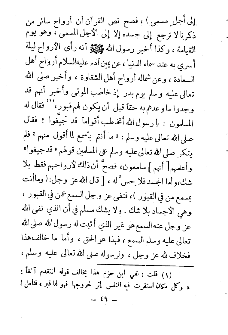 إِلَى أجل مُسَمّى) فصح نَص الْقُرْآن أَن أَرْوَاح سَائِر من ذكرنَا لَا ترجع إِلَى جسده إِلَّا إِلَى الْأَجَل الْمُسَمّى وَهُوَ يَوْم الْقِيَامَة وَكَذَا أخبر رَسُول الله صلى الله عَلَيْهِ وَسلم أَنه رأى الْأَرْوَاح لَيْلَة أسرِي بِهِ عِنْد سَمَاء الدُّنْيَا عَن يَمِين أَدَم عَلَيْهِ السَّلَام أَرْوَاح أهل السَّعَادَة وَعَن شِمَاله أَرْوَاح أهل الشقاوة وَأخْبر صلى الله عَلَيْهِ وَسلم يَوْم بدر إِذْ خَاطب الْمَوْتَى وَأخْبر أَنهم قد وجدوا مَا وعدهم بِهِ حَقًا قبل أَن يكون لَهُم قُبُور فَقَالَ لَهُ الْمُسلمُونَ يَا رَسُول الله أتخاطب أَقْوَامًا قد جيفوا فَقَالَ صلى الله عَلَيْهِ وَسلم مَا أَنْتُم بأسمع لما أَقُول مِنْهُم فَلم يُنكر صلى الله عَلَيْهِ وَسلم على الْمُسلمين قَوْلهم قد جيفوا وأعلمهم أَنهم سامعون فصح أَن ذَلِك لأرواحهم فَقَط بِلَا شكّ وَأما الْجَسَد فَلَا حس لَهُ قَالَ الله عز وَجل {وَمَا أَنْت بمسمع من فِي الْقُبُور} فنفى عز وَجل السّمع عَمَّن فِي الْقُبُور وَهِي الأجساد بِلَا شكّ وَلَا يشك مُسلم فِي أَن الَّذِي نفى الله عز وَجل عَنهُ السّمع هُوَ غير الَّذِي أثبت لَهُ رَسُول الله صلى الله عَلَيْهِ وَسلم السّمع فَهَذَا هُوَ الْحق وَأما مَا خَالف هَذَا فخلاف لله عز وَجل وَلِرَسُولِهِ صلى الله عَلَيْهِ وَسلم