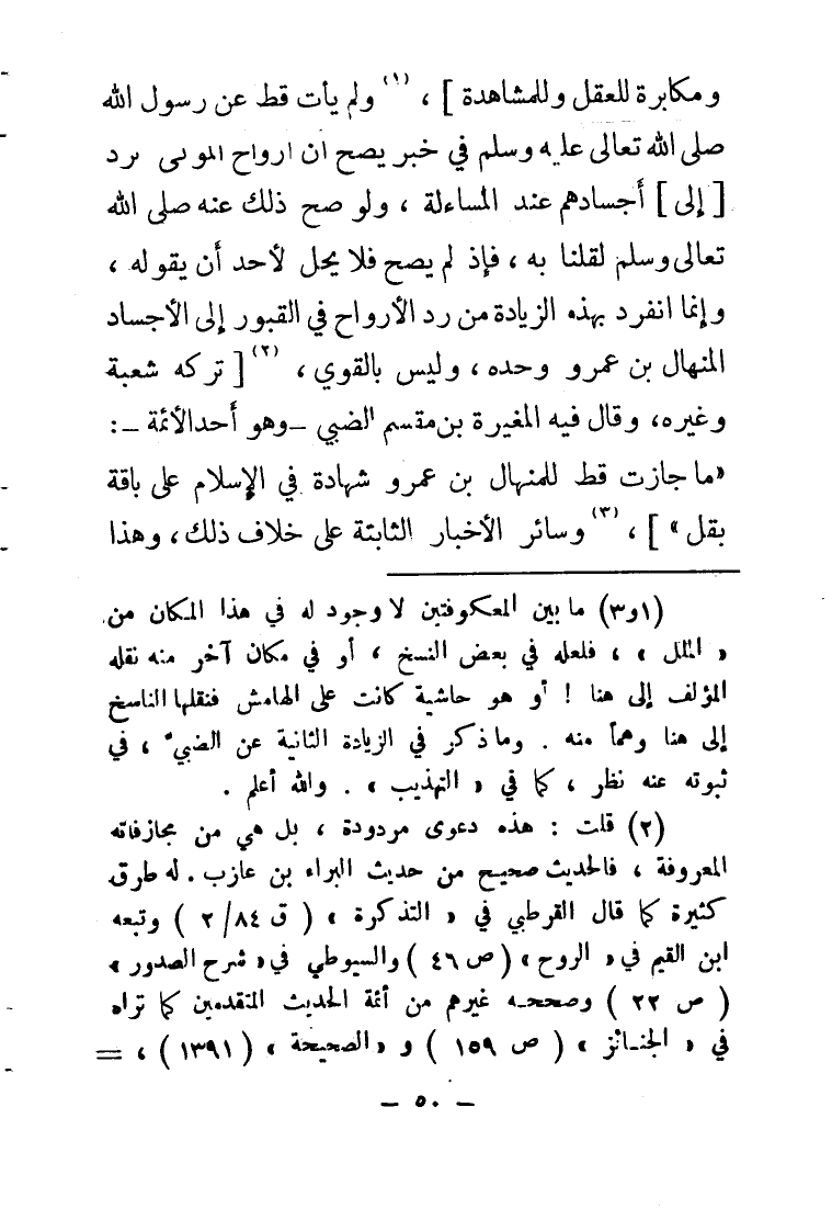 ومكابرة لِلْعَقْلِ وللمشاهدة وَلم يَأْتِ قطّ عَن رَسُول الله صلى الله عَلَيْهِ وَسلم فِي خبر يَصح أَن أَرْوَاح الْمَوْتَى ترد إِلَى اجسادهم عِنْد المساءلة وَلَو صَحَّ ذَلِك عَنهُ صلى الله عَلَيْهِ وَسلم لقلنا بِهِ فَإذْ لم يَصح فَلَا يحل لأحد أَن يَقُوله وَإِنَّمَا انْفَرد بِهَذِهِ الزِّيَادَة من رد الْأَرْوَاح فِي الْقُبُور إِلَى الأجساد الْمنْهَال بن عَمْرو وَحده وَلَيْسَ بِالْقَوِيّ تَركه شُعْبَة وَغَيره وَقَالَ فِيهِ الْمُغيرَة بن مقسم الضَّبِّيّ وَهُوَ أحد الْأَئِمَّة مَا جَازَت قطّ للمنهال بن عَمْرو شَهَادَة فِي الْإِسْلَام على باقة بقل وَسَائِر الْأَخْبَار الثَّابِتَة على خلاف ذَلِك وَهَذَا