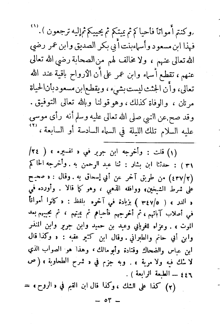 فَهَذَا ابْن مَسْعُود وَأَسْمَاء بنت أبي بكر الصّديق وَابْن عمر رَضِي الله تَعَالَى عَنْهُم وَلَا مُخَالف لَهُم فِي الصَّحَابَة رَضِي الله تَعَالَى عَنْهُم تقطع أَسمَاء وَابْن عمر على أَن الْأَرْوَاح بَاقِيَة عِنْد الله تَعَالَى وَأَن الجثث لَيست بِشَيْء وَيقطع ابْن مَسْعُود بِأَن الْحَيَاة مَرَّتَانِ والوفاة كَذَلِك وَهُوَ قَوْلنَا وَبِاللَّهِ تَعَالَى التَّوْفِيق