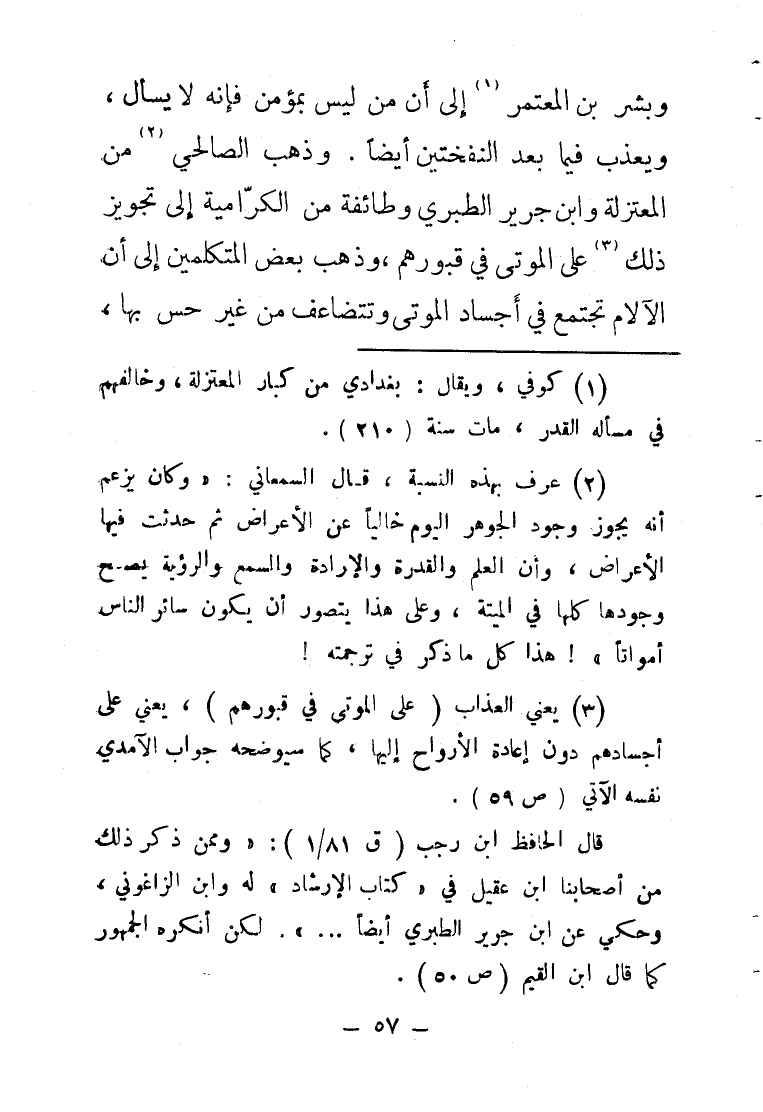 وَبشر بن الْمُعْتَمِر إِلَى أَن من لَيْسَ بِمُؤْمِن فَإِنَّهُ لَا يسْأَل ويعذب فِيمَا بعد النفختين أَيْضا وَذهب الصَّالِحِي من الْمُعْتَزلَة وَابْن جرير الطَّبَرِيّ وَطَائِفَة من الكرامية إِلَى تَجْوِيز ذَلِك على الْمَوْتَى فِي قُبُورهم وَذهب بعض الْمُتَكَلِّمين إِلَى أَن الآلام تَجْتَمِع فِي أجساد الْمَوْتَى وتتضاعف من غير حس بهَا فَإِذا حشروا أحسوا بهَا دفْعَة وَاحِدَة وَذهب ضرار بن عَمْرو وَبشر المريسي وَأكْثر الْمُتَأَخِّرين من الْمُعْتَزلَة إِلَى إِنْكَار ذَلِك كُله وَأنكر الجبائي وَابْنه والبلخي تَسْمِيَة الْملكَيْنِ