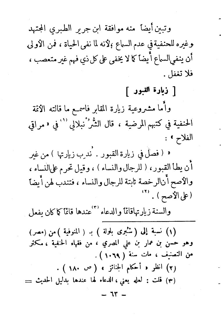 وَأما مَشْرُوعِيَّة زِيَارَة الْمَقَابِر فاسمع مَا قالته الْأَئِمَّة الْحَنَفِيَّة فِي كتبهمْ المرضية قَالَ الشُّرُنْبُلَالِيّ فِي مراقي الْفَلاح