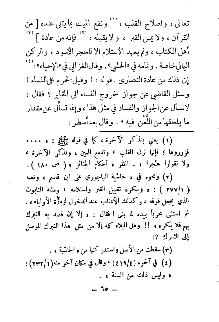 تَعَالَى وَإِصْلَاح الْقلب ونفع الْمَيِّت بِمَا يُتْلَى عِنْده من الْقُرْآن وَلَا يمس الْقَبْر وَلَا يقبله فَإِنَّهُ من عَادَة أهل الْكتاب وَلم يعْهَد الاستلام الا للحجر الْأسود والركن الْيَمَانِيّ خَاصَّة وَتَمَامه فِي الْحلَبِي وَقَالَ الْغَزالِيّ فِي الْإِحْيَاء إِن ذَلِك من عَادَة النَّصَارَى قَوْله وَقيل تحرم على النِّسَاء وَسُئِلَ القَاضِي عَن جَوَاز خُرُوج النِّسَاء إِلَى الْمَقَابِر فَقَالَ لَا تسْأَل عَن الْجَوَاز وَالْفساد فِي مثل هَذَا وَإِنَّمَا تسْأَل عَن مِقْدَار مَا يلْحقهَا من اللَّعْن فِيهِ وَقَالَ بعد أسطر