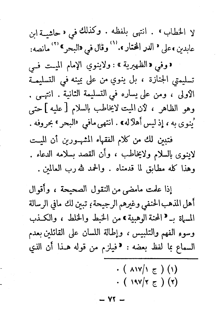 وَفِي الظَّهِيرِيَّة وَلَا يَنْوِي الإِمَام الْمَيِّت فِي تسليمتي الْجِنَازَة بل يَنْوِي من على يَمِينه فِي التسليمة الأولى وَمن على يسَاره فِي التسليمة الثَّانِيَة انْتهى وَهُوَ الظَّاهِر لِأَن الْمَيِّت لَا يُخَاطب بِالسَّلَامِ عَلَيْهِ حَتَّى ينوى بِهِ إِذْ لَيْسَ اهلا لَهُ انْتهى مَا فِي الْبَحْر بِحُرُوفِهِ