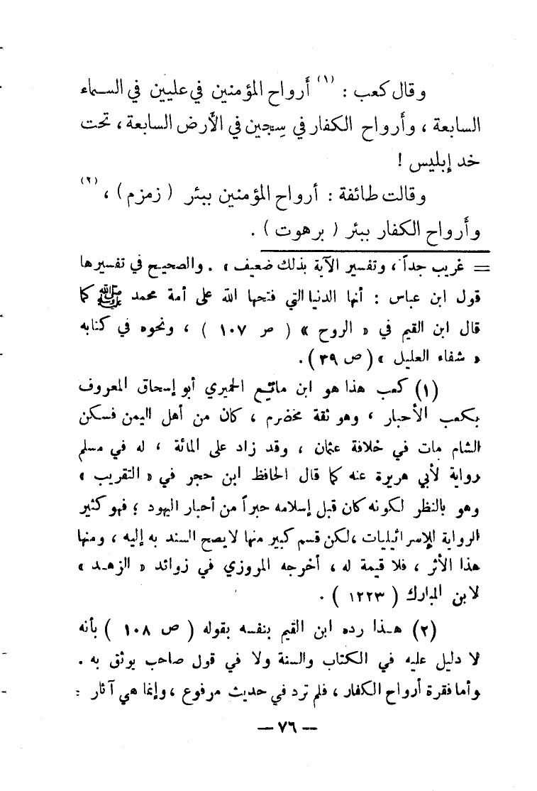 وَقَالَ كَعْب أَرْوَاح الْمُؤمنِينَ فِي عليين فِي السَّمَاء السَّابِعَة وأرواح الْكفَّار فِي سِجِّين فِي الأَرْض السَّابِعَة تَحت خد إِبْلِيس