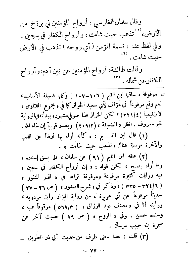وَقَالَ سلمَان الْفَارِسِي أَرْوَاح الْمُؤمنِينَ فِي برزخ من الأَرْض تذْهب حَيْثُ شَاءَت وأرواح الْكفَّار فِي سِجِّين وَفِي لفظ عَنهُ نسمَة الْمُؤمن أَي روحه تذْهب فِي الأَرْض حَيْثُ شَاءَت