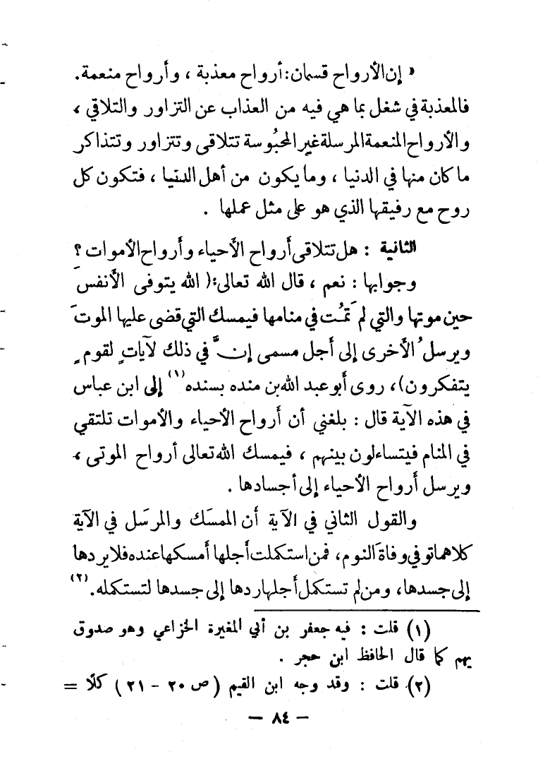إِن الْأَرْوَاح قِسْمَانِ الْأَرْوَاح قِسْمَانِ أَرْوَاح معذبة وأرواح منعمة فالمعذبة فِي شغل بِمَا هِيَ فِيهِ من الْعَذَاب عَن التزاور والتلاقي والأوراح المنعمة الْمُرْسلَة غير المحبوسة تتلاقى وتتزاور وتتذاكر مَا كَانَ مِنْهَا فِي الدُّنْيَا وَمَا يكون من أهل الدُّنْيَا فَتكون كل روح مَعَ رفيقها الَّذِي هُوَ على مثل عَملهَا