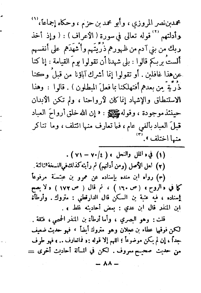 مُحَمَّد بن نصر الْمروزِي وَأَبُو مُحَمَّد بن حزم وَحَكَاهُ إِجْمَاعًا وأدلتهم قَوْله تَعَالَى فِي سُورَة الْأَعْرَاف {وَإِذ أَخذ رَبك من بني آدم من ظُهُورهمْ ذُرِّيتهمْ وأشهدهم على أنفسهم أَلَسْت بربكم قَالُوا بلَى شَهِدنَا أَن تَقولُوا يَوْم الْقِيَامَة إِنَّا كُنَّا عَن هَذَا غافلين أَو تَقولُوا إِنَّمَا أشرك آبَاؤُنَا من قبل وَكُنَّا ذُرِّيَّة من بعدهمْ أفتهلكنا بِمَا فعل المبطلون} قَالُوا وَهَذَا الاستنطاق وَالْإِشْهَاد إِنَّمَا كَانَ لأرواحنا وَلم تكن الْأَبدَان حِينَئِذٍ مَوْجُودَة وَقَوله صلى الله عَلَيْهِ وَسلم إِن الله خلق أَرْوَاح الْعباد قبل الْعباد بألفي عَام فَمَا تعارف مِنْهَا ائتلف وَمَا تناكر مِنْهَا اخْتلف