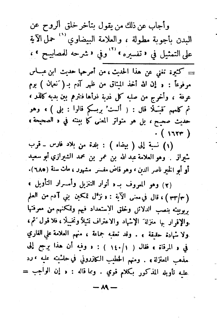 وَأجَاب عَن ذَلِك من يَقُول بتأخر خلق الرّوح عَن الْبدن بأجوبة مُطَوَّلَة والعلامة الْبَيْضَاوِيّ حمل الْآيَة على التَّمْثِيل فِي تَفْسِيره وَفِي شَرحه للمصابيح