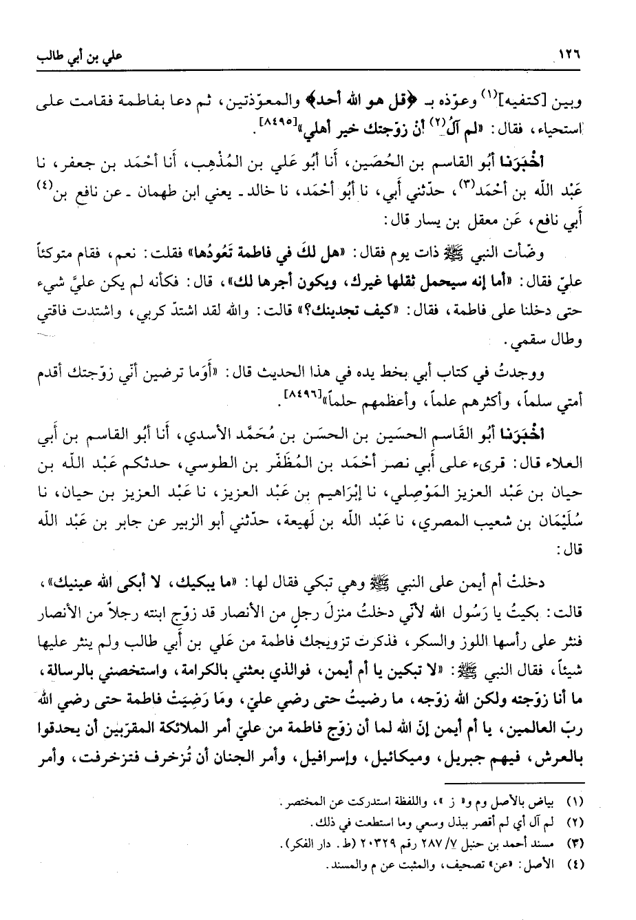 وبين كتفيه (1) وعوذه ب قل هو الله أحد والمعوذتين ثم دعا بفاطمة فقامت على استحياء فقال لم ال (2) أن وزجتك خير أهلي أخبرنا أبو القاسم بن الحصين أنا أبو علي بن المذهذب أنا أحمد بن جعفر نا عبد الله بن احمد (3) حدثني أبي نا أبو أحمد نا خالد يعني ابن طهمان عن نافع بن () 4 أبي نافع عن معقل بن يسار قال وضأت النبي (صلى الله عليه وسلم) ذات يوم فقال هل لك في فاطمة تعودها فقلت نعم فقام متوكئا علي فقال أما إنه سيحممل ثقلها غيرك ويكون أجرها لك قال فكأنه لم يكن علي شئ حتى دخلنا على فاطمة فقال كيف تجدينك قالت والله لقد اشتد كربي واستدت فاقتي وطال سقمي ووجدت في كتاب أبي بخط يده في هذا الحديث قال أوما ترضين أني زوجتك أقدم أمتي سلما وأكثرهم علما وأعظمهم حلما أخبرنا أبو القاسم الحسين بن الحسن بن محمد الأسدي أنا أبو القاسم بن أبي العلاء قال قرئ على أبي نصر أحمد بن المظفر بن الطوسى حدثكم عبد الله بن حيان بن عبد العزيز الموصلي نا إبراهيم بن عبد العزيز نا عبد العزيز بن حيان نا سليمان بن شعيب المصري نا عبد الله بن لهيعة حدثني أبو الزبير عن جابر بن عبد الله قال دخلت أم أيمن على النبي (صلى الله عليه وسلم) وهي تبكي فقال لها ما يبكيك لا ابكى الله عينينك قالت بكيت يا رسول الله لأني دخلت منزل رجل من الأنصار قد زوج ابنته رجلا من الأنصار فنثر على رأسها اللوز والسكر فذكرت تزويجك فاطمة من علي بن أبي طالب ولم ينثر عليها شيئا فقال النبي (صلى الله عليه وسلم) لا تبكني يا أم أيمن فوالذي يعثني بالكرامة واستخصني بالرسالة ما أنا زوجته ولكن الله زوجه ما رضيت حتى رضي علي وما رضيت فاطمة حتى رضي الله رب العالمين يا أم أيمن إن الله لما أن زوج فاطمة من علي أمر الملائكة المقربين أن يحدقوا بالعرش فيهم جبريل وميكائيل وإسرافيل وأمر الجنان أن تزخرف فتزخرفت وأمر