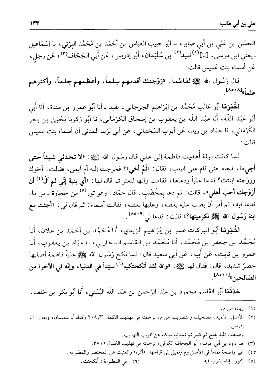الحسن بن علي بن أبي صابر نا أبو حبيب العباس بن أحمد بن محمد البرتي نا إسماعيل يعني ابن موسى (1) ناتليد (2) ب سليمان أبو إدريس عن أبي الجحاف (3) عن رجل عن أسماء بنت عميس قالت قال رسول الله (صلى الله عليه وسلم) لفاطمة زوجتك أقدمهم سلما وأعظمهم حلما وأكثرهم علما أخبرنا أبو غالب محمد بن إبراهيم الجرجاني بفيد أنا أبو عمرو بن مندة أنا أبي أبو عبد الله أنا عبد الله بن يعقوب بن إسحاق الكرماني نا أبو زكريا يحيى بن بحر الكرماني نا حماد بن زيد عن أيوب السختياني عن أبي بريد المدني أن أسماء بنت عميس قالت لما كانت ليلة أهديت فاطمة إلى علي قال رسول الله (صلى الله عليه وسلم) لا تحدثي شيئا حتى أجئ فجاء حتى قام على الباب فقال ثم أخي فخرجت إليه أم أيمن فقالت أخوك وزوجته ابنتك فدعا عليا ودعاها فقامت وأنها لتعثر ثم قال لها أي بنية إني لم ال (4) أن أزوجك أحب أهلي قالت ثم دعا بمخضب قال حماد وهو تور (5) من حجارة من ماء فدعا فيه ثم أمر أن يصب عليه بعضه وعليها بعضه فقالت أسماء ثم قال لي أجئت مع ابنة رسول الله (صلى الله عليه وسلم) تكرمينها قالت فدعا لي أخبرنا أبو البركات عمر بن إبراهيم الزيدي أنا محمد بن أحمد بن علان أنا محمد بن جعفر بن محمد أنا محمد بن القاسم المحاربي نا عباد بن يعقوب أنا عمرو بن ثابت عن أبيه عن أبي سعيد قال لما نكح رسول الله (صلى الله عليه وسلم) عليا فاطمة أصابها حصر شديد قال فقال لها (صلى الله عليه وسلم) والله لقد أنكحتكيه (6) سيدا في الدنيا وإنه في الاخرة من الصالحين حدثنا أبو القاسم محمود بن عبد الرحمن بن عبد الله البستي أنا أبو بكر بن خلف