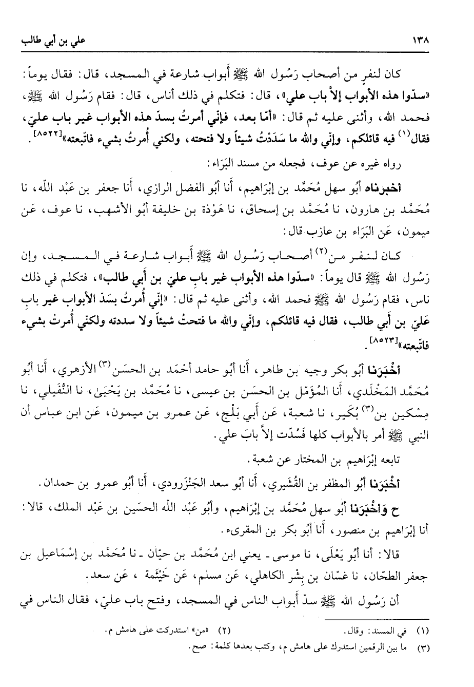 كان لنفر من أصحاب رسول الله (صلى الله عليه وسلم) أبواب شارعة في المسجد قال فقال يوما سدوا هذه الأبواب إلا باب علي قال فتكل في ذلك أناس قال فقام رسول الله (صلى الله عليه وسلم) فحمد الله وأثنى عليه ثم قال أما بعد فإني أمرت بسد هذه الأبواب غير باب علي فقال فيه قائلكم وإني والله ما سددت شيئا ولا فتحته ولكني أمرت بشئ فاتبعته رواه غيره عن عوف فجعله من مسند البراء أخبرناه أبو سهل محمد بن إبراهيم أنا أبو الفضل الرازي أنا جعفر بن عبد الله نا محمد بن هارون نا محمد بن إسحاق نا هوذة بن خليفة أبو الأشهب نا عوف عن ميمون عن البراء بن عازب قال كان لنفر من (2) أصحاب رسول الله (صلى الله عليه وسلم) أبواب شارعة في المسجد وإن رسول اله (صلى الله عليه وسلم) قال يوما سدوا هذه الأبواب غير باب علي بن أبي طالب فتكلم في ذلك ناس فقام رسول الله (صلى الله عليه وسلم) فحمد الله وأثنى عليه ثم قال إني أمرت بسد الأبواب غير باب علي بن أبي طالب فقال فيه قائلكم وإني والله ما فتحت شيئا ولا سددته ولكني أمرت بشئ فاتبعته أخبرنا أبو بكر وجيه بن طاهر أن أبو حامد أحمد بن الحسن (3) الأزهري أن أبو محمد المخلدي أنا المؤمل بن الحسن بن عيسى نا محمد بن يحيى نا النفيلي نا مسكين (3) بن بكير نا سعبة عن أبي بلج عن عمرو بن ميمون عن ابن عباس أن النبي (صلى الله عليه وسلم) أمر بالأبواب كلها فسدت إلا باب علي تابعه إبراهيم بن المختار عن شعبة أخبرنا أبو المظفر بن القشيري أن أبو سعد الجنزرودي أنا أبو عمرو بن حمدان ح وأخبرنا أبو سهل محمد بن إبراهيم وأبو عبد الله الحسين بن عبد الملك قالا أنا إبراهيم بن منصور أنا أبو بكر بن المقرئ قالا أن أبو يعلى نا موسى يعني ابن محمد بن حيان نا محمد بن إسماعيل جعفر الطحان نا غسان بن بشر الكاهلي عن مسلم عن خيثمة عن سعد أن رسول الله (صلى الله عليه وسلم) سد أبواب الناس في المسجد وفتح باب علي فقال الناس في