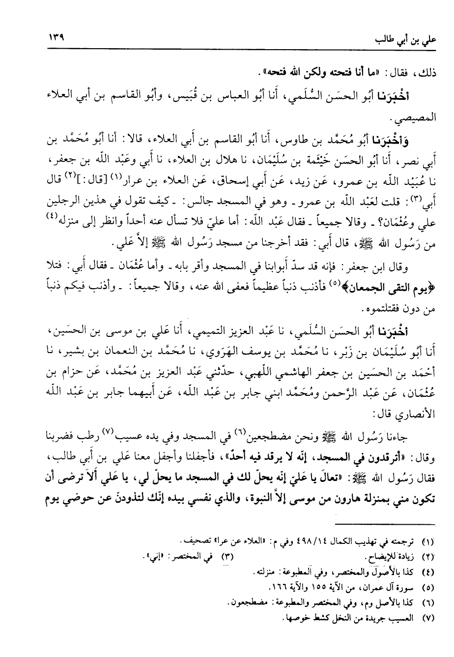 ذلك فقال ما أنا فتحته ولكن الله فتحه أخبرنا أو الحين السلمي أنا أبو العباس بن قبيس وأبو القاسم بن أبي العلاء المصيصي وأخبرنا أبو محمد بن طاوس أنا أبو القاسم بن أبي العلاء قالا أنا أبو محمد بن أبي نصر أنا أبو الحسن خيثمة بن سليمان نا هلال بن العلاء نا أبي وعبد الله بن جعفر نا عبيد الله بن عمرو عن زيد عن أبي إسحاق عن العلاء بن عرار (1) قال (2) قال أبي (3) قلت لعبد الله بن عمرو وهو في المسجد جالس كيف تقول في هذين الرجلين علي وعثمان وقالا جميعا فقال عبد الله أما علي فلا تسأل عنه أحدا وانظر إلى منزلة (4) من رسول الله (صلى الله عليه وسلم) قال أبي أخرجنا من مسجد رسول الله (صلى الله عليه وسلم) إلا علي وقال ابن جعفر فإنه قد سد أبوابنا في المسجد وأقر بابه وأما عثمان فقال أبي قتلا يوم التقى الجمعان (5) فأذنب ذنبا عظيما فعفى الله عنه وقالا جميعا وأذنب فيكم ذنبا من دون فقتلتموه أخبرنا أبو الحسن السلمي نا عبد العزيز التميمي أنا علي بن موسى بن الحسين أنا أبو سليمان ن زبر نا محمد بن يوسف الهروي نا محمد بن النعمان بن بشير نا أحمد بن الحسين بن جعفر الهاشمي اللهبي حدثني عبد العزيز بن محمد عن حزام بن عثمان عن عبد الرحمن ومحمد ابني جابر بن عبد الله عن أبيهما جابر بن عبد الله الأنصاري قال جائنا رسول الله (صلى الله عليه وسلم) ونحن مصطجعين (6) في المسجد وفي يده عسيب (7) رطب فضربنا وقال أترقدون في المسجد إنه لا يرقد فيه أحدا فأجفلنا وأجفل معنا علي بن أبي طالب فقال رسول الله (صلى الله عليه وسلم) تعال يا علي إنه يحل لك في المسجد ما يحل لي يا علي ألا ترضى أن تكون مني بمنزلة هارون من موسى إلا النيوة والذي نفسي بيده إنك لتذودن عن حوضي يوم