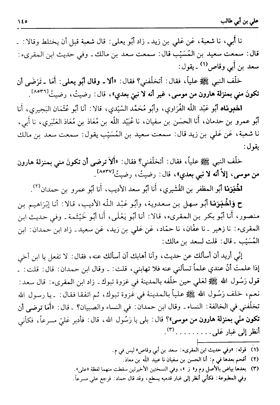 نا أبي نا شعبة عن علي بن زيد زاد أبو يعلى قال شعبة أن يختلط وقال قال سمعت سعيد بن المسيب قال سمعت سعد بن مالك وفي حديث ابن المقرئ سعد بن أبي وقاص (1) يقول خلف النبي (صلى الله عليه وسلم) عليا فقال أتخلفني فقال إلا وقال أبو يعلى أما ترضى أن تكون مني بمنولة هارون من موسى غير أنه لا نبي بعدي قال رضيت رضيت أخبرناه أبو عبد الله الفراوي وأبو محمد السيدي قالا أنا أبو عثمان البجيري أنا أبو عمرو بن حدمان أنا الحسن بن سفيان نا عبيد الله بن معاذ بن معاذ العنبري نا أبي نا شعبة عن علي بن زيد قال سمعت سعيد بن المسيب يقول سمعت سعد بن مالك يقول خلف النبي (صلى الله عليه وسلم) عليا فقال أتخلفني فقال ألا ترضى أن تكون مني بمنزلة هارون من موسى إلا أنه لا نبي بعدي قال رضيت رضيت أخبرنا أبو المظفر بن القشيري أنا أبو سعد الأديب أنا أبو عمرو بن حمدان (2) ح وأخبرنا أبو سهل بن سعدويه وأبو عبد الله الأديب قالا أنا إبراهيم بن منصور أنا أبو بكر بن المقرئ قالا أنا أبو يعلى أنا أبو خيثمة وفي حديث ابن المقرئ نا زهير نا عفان نا حماد عن علي بن زيد عن سعيد زاد ابن حمدان ابن المسيب قال قلت لسعد بن مالك إني أريد أن أسألك عن حديث وأنا أهابك أن أسألك عنه فقال لا تفعل يا ابن أخي إذا علمت أن عندي علما نسألني عنه فلا تهابني قلت وقال ابن حمدان قال قلت قول رسول الله (صلى الله عليه وسلم) لعلي خلفه بالمدينة في غزوة تبوك زاد ابن المقرئ قال سعد نعم خلف رسول الله صلى الله عليه وسلم عليا بالمدينة في غزوة تبوك ثم اتفقا فقال يا رسول الله تخلفني في الخالفة النساء وقال ابن حمدان في النساء والصبيان قال أما ترضى أن تكون مني بمنزلة هارون من موسى قال بلى يا رسول الله قال فأدير علي مسرعا فكأني أنظر إلى غبار على