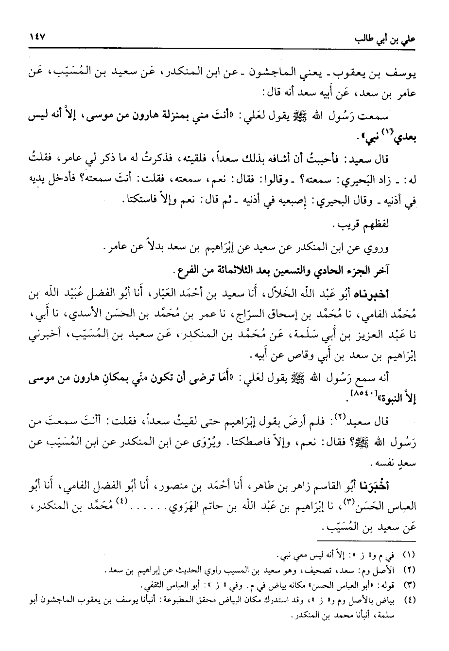 يوسف بن يعقوب يعني الماجشون عن ابن المنكدر عن سعيد بن المسيب عن عامر بن سعد عن أبيه سعد أنه قال سمعت رسول الله (صلى الله عليه وسلم) يقول لعلي أنت مني بمنزلة هارون من موسى إلا أنه ليس بعدي (1) نبي * * *] قال سعيد فأحببت أن أشافه بذلك سعدا فلقيته فذكرت له ما ذكر لي عامر فقلت له زاد البحيري سمعته وقالوا فقال نعم سمعته فقلت أنت سمعته فأدخل يديه في أذنيه وقال البحيري إصبعيه في أذنيه ثم قال نعم وإلا فاستكتا لفظهم قريب وروي عن ابن المنكدر عن سعيد عن إبراهيم بن سعد بدلا عن عامر اخر الجزء الحادي والتسعين بعد الثلاثمائة من الفرع أخبرناه أبو عبد الله الخلال أنا سعيد بن أحمد العيار أنا أبو الفضل عبيد الله بن محمد الفامي نا محمد بن إسحاق السراج نا عمر بن محمد بن الحسين الأسدي نا أبي نا عبد العزيز بن أبي سلمة عن محمد بن المنكدر عن سعيد بن المسيب أخبرني إبراهيم بن سعد بن أبي وقاص عن أبيه أنه سمع رسول الله (صلى الله عليه وسلم) يقول لعلي أما ترضى أن تكون مني بمكان هارون من موسى إلا النبوة قال سعيد (2) فلم أرض بقول إبراهيم حتى لقيت سعدا فقلت أأنت سمعت من رسول الله (صلى الله عليه وسلم) فقال نعم وإلا فاصطكتا ويروى عن ابن المنكدر عن ابن المسيب عن سعد نفسه أخبرنا أبو القاسم زاهر بن طاهر أنا أحمد بن منصور أنا أبو الفضل الفامي أنا أبو العباس الحسن (3) نا إبراهيم بن عبد الله بن حاتم الهروي (4) محمد بن المنكدر عن سعيد بن المسيب