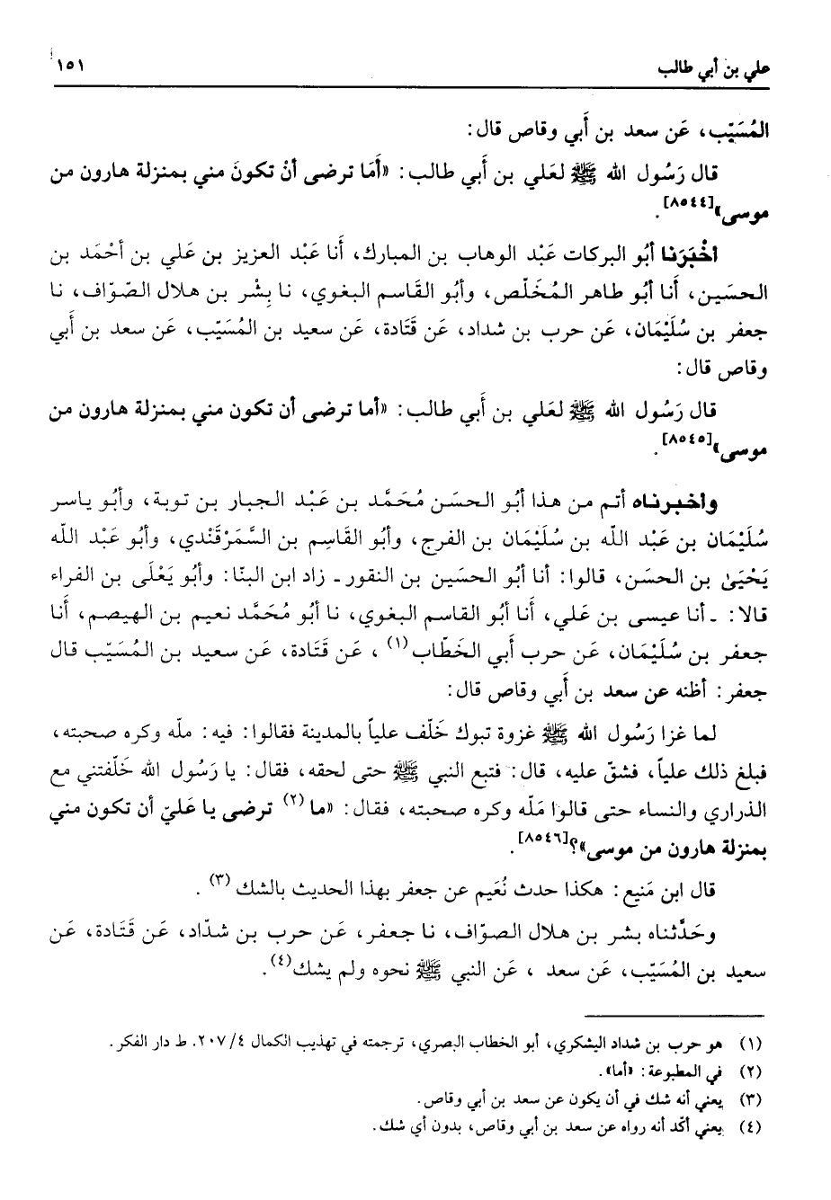المسيب عن سعد بن أبي وقاص قال قال رسول الله (صلى الله عليه وسلم) لعلي بن أبي طالب أما ترضى أن تكون مني بمنزلة هارون من موسى أخبرنا أبو البركات عبد الوهاب بن المبارك أنا عبد العزيز بن علي بن أحمد بن الحسين أنا أبو طاهر المخلص وأبو القاسم البغبوي نا بشر بن هلال الصواف نا جعفر بن سليمان عن حرب بن شداد عن قتادة عن سعيد بن المسيب عن سعد بن أبي وقاص قال قال رسول الله (صلى الله عليه وسلم) لعلي بن أبي طالب أما ترضى أن تكون مني بمنزلة هارون من موسى وأخبرناه أتم من هذا أبو الحسن محمد بن عبد الجبار بن توبة وأبو ياسر سليمان بن عبد الله بن سليمان بن الفرج وأبو القاسم بن السمرقندي وأبو عبد الله يحيى بن الحسن قالوا أنا أبو الحسين بن النقور زاد ابن البنا وأبو يعلى بن الفراء قالا أنا عيسى بن علي أنا أبو القاسم البغوي نا أبو محمد نعيم بن الهيصم أنا جعفر بن سليمان عن حرب أبي الخطاب (1) عن قتادة عن سعيد بن المسيب قال جعفر أظنه عن سعد بن أبي وقاص قال لما غزا رسول الله (صلى الله عليه وسلم) غزوة تبوك خلف عليا بالمدينة فقالوا فيه مله وكره صحبته فبلغ ذلك عليا فشق عليه قال فتبع النبي (صلى الله عليه وسلم) حتى لحقه فقال يا رسول الله خلفتني مع الذراري والنساء حتى قالوا مله وكره صحبته فقال ما (2) ترضى يا علي أن تكون مني بمنزلة هارون من موسى قال ابن منيع هكذا حديث نعيم عن جعفر بهذا الحديث بالشك (3) وحدثناه بشر بن هلال الصواف نا جعفر عن حرب بن شداد عن قتادة عن سعيد بن المسيب عن سعد عن النبي (صلى الله عليه وسلم) نحوه ولم يشك (4)
