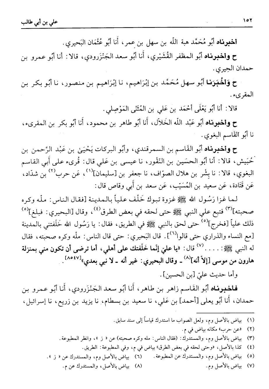 أخبرناه أبو محمد هبة الله بن سهل بن عمر أنا أبو عثمان البحيري ح وأخبرنا أبو المظفر القشيري أنا أبو سعد الجنزرودي قالا أنا أبو عمرو بن حمدان الحيري ح وأخبرنا أبو سهل محمد بن إبراهيم نا إبراهيم بن منصور نا أبو بكر بن المقرئ قالا أنا أبو يعلى أحمد بن علي بن المثنى الموصلي ح وأخبرناه أبو عبد الله الخلال انا أبو طاهر بن محمود انا أبو بكر بن المقرئ نا أبو القاسم البغوي ح وأخبرناه أبو القاسم بن السمرقندي وأبو البركات يحيى بن عدب الرحمن بن حبيش قالا أنا أبو الحسين بن النقور نا عيسى بن علي قال قرئ على أبي القاسم البغوي قالا نا بشر بن هلال الصواف نا جعفر بن سليمان (1) عن حرب (2) بن شداد عن قتادة عن سعيد بن المسيب عن سعد بن أبي وقاص قال لما غزا رسول الله (صلى الله عليه وسلم) غزوة تبوك خلف عليا بالمدينة فقال الناس مله وكره صحبته (3) فتبع علي النبي (صلى الله عليه وسلم) حتى لحقه في بعض الطرق (4) وقال البحيري فبلغ ذلك عليا (5) فخرج حتى لحق النبي (صلى الله عليه وسلم) في الطريق فقال يا رسول الله خلفتني بالمينه مع النساء والذراري حتى قالوا قال البحيري حتى قال (6) الناس مله وكره صحبته فقال له النبي (صلى الله عليه وسلم) (7) قال يا علي إنما خلفتك على أهلي أما ترضى أن تكون مني بمنزلة هارون من موسى إلا أنه (8) وقال البحيري غير أنه لا نبي بعدي وأما حديث علي عن الحسين فأخبرناه أبو القاسم زاهر بن طاهر أنا أبو سع الجنزرودي أنا أبو عمرو بن حمدان أنا أبو يعلى أحمد بن علي نا سعيد بن بسطام نا يزيد بن زريع نا إسرائيل