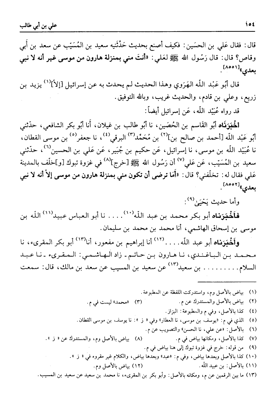 قال فقال علي بن الحسين فكيف أصنع بحديث حدثنيه سعيد بن المسيب عن سعد بن أبي وقاص قال قال رسول الله (صلى الله عليه وسلم) لعلي انت مني بمنزلة هارون من موسى غير أنه لا نبي بعدي قال أبو عبد الله الهروي وهذا الحديث لم يحدث به عن إسرائيل إلا (1) يزيد بن زريع وعلي بن قادم والحديث غريب وبالله التوفيق قد وراه عبيد الله عن إسرائيل أيضا أخبرناه أبو القاسم بن الحصين نا أبو طالب بن غيلان أنا أبو بكر الشافعي حدثني أبو عبد الله أحمد بن صالح بن (2) بن محمد (3) البرقي (4) نا جعفر (5) بن موسى القطان نا عبيد الله بن موسى نا إسرائيل عن حكيم بن جبير عن علي بن الحسين (6) حدثني سعيد بن المسيب عن علي أن رسول الله (صلى الله عليه وسلم) خرج (8) في عزوة تبوك وخلف بالمدينة علي فقال له تخلفني قال أما ترضى أن تكون مني بمنزلة هارون من موسى إلا أنه لا نبي بعدي ح وأما حديث يحيى (9) فأخبرناه أبو بكر محمد بن عبد الله (10) نا أبو العباس عبيد (11) الله بن موسى بن إسحاق الهاشمي أنا محمد بن محمد بن سليمان وأخبرناه أو عبد الله (12) أنا إبراهيم بن مفعور أنا (13) أبو بكر المقرئ نا محمد بن الباغندي نا هارون بن حاتم زاد الهاشمي المقرئ نا عبد السلام بن سعيد عن سعيد بن المسيب عن سعد بن مالك قال سمعت النبي (صلى الله عليه وسلم) وفي حديث الهاشمي عن سعد أن