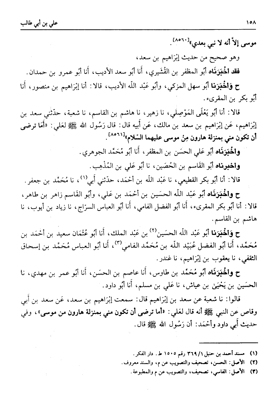 موسى إلا أنه لا نبي بعدي وهو صحيح من حديث إبراهيم بن سعد فقد أخبرناه أبو المظف بن القشيري أنا أبو سعد الأديب أنا أبو عمرو بن حمدان ح وأخبرنا أبو سهل المزكي وأبو عبد الله الأديب قالا أنا إبراهيم بن منصور أنا أبو بكر بن المقرئ قالا أنا أبو يعلى الموصلي نا زهير نا هاشم بن القاسم نا شعبة حدثني سعد بن إبراهيم عن إبراهيم بن سعد بن مالك عن أبيه قال قال رسول الله (صلى الله عليه وسلم) لعلي أما ترضى أن تكون مني بمنزلة هارون من موسى عليهما السلام وأخبرناه أبو علي الحسن بن المظفر أنا أبو محمد الجوهري واخبرناه أبو القاسم بن الحصين نا أبو علي بن المذهب قالا أنا أبو بكر القطيعي نا عبد الله بن أحمد حدثني أبي (1) نا محمد بن جعفر ح وأخبرناه أبو عبد الله الحسين بن أحمد بن علي وأبو القاسم زاهر بن طاهر قالا أنا أبو بكر المقرئ أنا أبو الفضل الفامي أنا أبو العباس السراج نا زياد بن أيوب نا هاشم بن القاسم ح وأخبرنا أبو عبد الله الحسين (2) بن عبد الملك أنا أبو عثمان سعيد بن احمد بن محمد أنا أبو الفضل عبيد الله بن محمد الفامي (3) أنا أبو العباس محمد بن إسحاق الثقفي نا يعقوب بن إبراهيم نا غندر ح وأخبرناه أبو محمد بن طاوس أنا عاصم بن الحسن أنا أبو عمر بن مهدي نا الحسين بن يحيى بن عياش ناعلي بن مسلم أنا أبو داود قالوا نا شعبة عن سعد بن إبراهيم قال سمعت إبراهيم بن سعد عن سعد بن أبي وقاص عن النبي (صلى الله عليه وسلم) أنه قال لعلي أما ترضى أن تكون مني بمنزلة هارون من موسى وفي حديث أبي داود وأحمد أن رسول الله (صلى الله عليه وسلم) قال