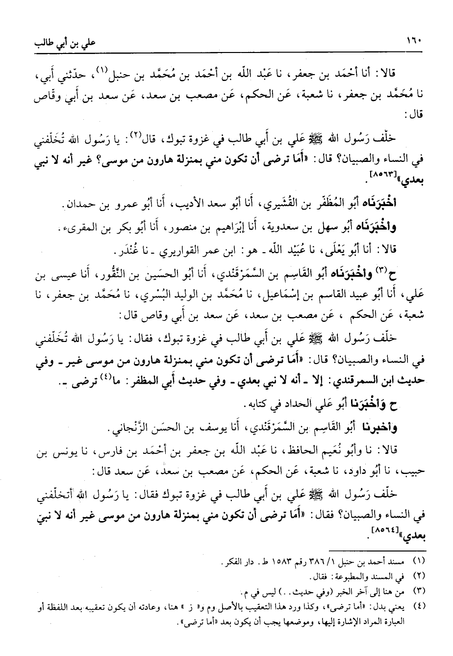 قالا أنا أحمد بن جعفر نا عبد الله بن أحمد بن محمد بن حنبل (1) حدثني أبي نا محمد بن جعفر نا شعبة عن الحكم عن مصعب بن سعد عن سعد بن أبي وقاص قال خلف رسول الله (صلى الله عليه وسلم) علي بن أبي طالب في غزوة تبوك قال (2) يا رسول الله تخلفني في النساء والصبيان قال أما ترضى أن تكون مني بمنزلة هارون من موسى غير أنه لا نبي بعدي أخبرناه أبو المظفر بن القشيري أنا أبو سعد الأديب أنا أبو عمرو بن حمدان واخبرناه أبو سهل بن سعدوية أنا إبراهيم بن منصور أنا أبو بكر بن المقرئ قالا انا أبو يعلى نا عبيد الله هو ابن عمر القواريري نا غندر ح (3) وأخبرناه أبو القاسم بن السمرقندي أنا أبو الحسين بن النقور أنا عيسى بننن علي أنا أبو عبيد القاسم بن إسماعيل نا محمد بن الوليد البسري نا محمد بن جعفر نا شعبة عن الحكم عن مصعب بن سعد عن سعد بن أبي وقاص قال خلف رسول الله (صلى الله عليه وسلم) علي بن أبي طالب في غزوة تبوك فقال يا رسول الله تخلفني في النساء والصبيان قال أما ترضى أن تكون مني بمنزلة هارون من موسى غير وفي حديث ابن السمرقندي إلا أنه لا نبي بعدي وفي حديث أبي المظفر ما (4) ترضى ح وأخبرنا أبو علي الحداد في كتابه وأخبرنا أبو القاسم بن السمرقندي أنا يوسف بن الحسن الزنجاني قالا نا وأبو نعيم الحافظ نا عبد الله بن جعفر بن أحمد بن فارس نا يونس بن حبيب نا أبو داود نا شعبة عن الحكم عن مصعب بن سعد عن سعد قال خلف رسول الله (صلى الله عليه وسلم) علي بن أبي طالب في غزوة تبوك فقال يا رسول الله أتخلفني في النساء والصبيان فقال أما ترضى أن تكون مني بمنزلة هارن من موسى غير أنه لا نبي بعدي