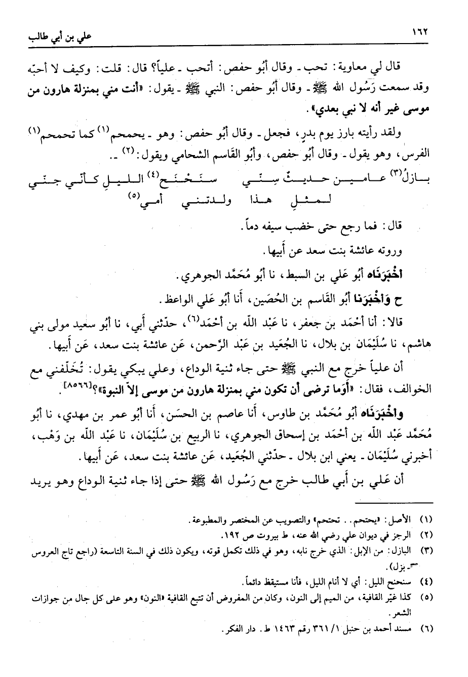 قال لي معاوية تحب وقال أبو حفص أتحب عليا قال قلت وكيف لا أحبه وقد سمعت رسول الله (صلى الله عليه وسلم) وقال أبو حفص النبي صلى الله عليه وسلم) يقول أنت مني بمنزلة هارون من موسى غير أنه لا نبي بعدي ولقد رأيته بارز يوم بدر فجعل وقال أبو حفص وهو يحمحم (1) كما تحمحم (1) الفرس وهو يقول وقال أبو حفص وأبو القاسم الشحامي ويقول (2) بازل (3) عامين حديث سني سنحنح (4) الليل كأني جني لمثل هذا ولدتني أمي (5) قال فما رجع حتى خضب سيفه دما وروته عائشة بنت سعد عن أبيها أخبرناه أبو علي بن السبط نا أبو محمد الجوهري ح واخبرنا أبو القاسم بن الحصين أنا أبو علي الواعظ قالا أنا أحمد بن جعفر نا عبد الله بن أحمد (6) حدثني أبي نا أبو سعيد مولى بني هاشم نا سليمان بن بلال نا الجعيد بن عبد الرحمن عن عائشة بنت سعد عن أبيها أن عليا خرج مع النبي (صلى الله عليه وسلم) حتى جاء ثنية الوداع وعلي يبكي يقول تخلفني مع الخوالف فقال أوما ترضى أن تكون مني بمنزلة هارون من موسى إلا النبوة وأخبرناه أبو محمد بن طاوس أنا عاصم بن الحسن أنا أبو عمر بن مهدي نا أبو محمد عبد الح له بن أحمد بن إسحاق الجوهري نا الربيع بن سليمان نا عبد الله بن وهب أخبرني سليمان يعني ابن بلال حدثني الجعيد عن عائشة بنت سعد عن أبيها أن علي بن أبي طالب خرج مع رسول الله (صلى الله عليه وسلم) حتى إذا جاء ثنية الوداع وهو يريد