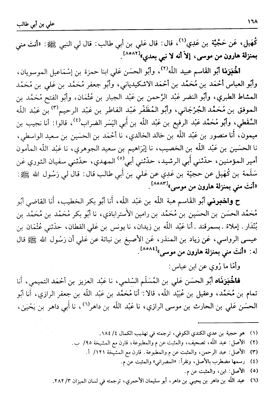 كهيل عن حجية بن عدي (1) قال قال علي بن أبي طالب قال لي النبي (صلى الله عليه وسلم) أنت مني بمنزلة هارون من موسى إلا أنه لا نبي بعدي أخبرنا أبو القاسم عبيد الله (2) وأبو الحسن علي ابنا حمزة بن إسماعيل الموسويان وأبو العباس أحمد بن محمد بن أحمد الاشكيدياني وأبو جعفر محمد بن علي بن محمد المشاط الطبري وأبو النضر عبد الرحمن بن عبد الجبار بن عثمان وأبو الفتح محمد بن الموفق بن محمد الجرجاني وأبو المظفر عبد الفاطر بن عبد الرحيم (3) بن عبد الله السقطي وأبو محمد عبد الرفيع بن عبد الله بن أبي اليسر الضراب (4) قالوا أنا نجيب بن ميمون أنا منصور بن عبد الله بن خالد الخالدي نا أحمد بن الحسين بن سعي الواسطي نا الحسين بن عبد الله بن الخصيب نا إبراهيم بن سعيد الجوهري نا عبد الله المأمون أمير المؤمنين حدثني أبي الرشيد حدثني (5) أبي المهدي حدثني سفيان الثوري عن سلمة بن كهيل عن حجية بن عدي عن علي بن أبي طالب قال قال لي رسول الله (صلى الله عليه وسلم) أنت مني بمنزلة هارون من موسى ح وأخبرني أبو القاسم هبة الله بن عبد الله أنا أبو بكر الخطيب أنا القاضي أبو محمد الحسن بن الحسين بن محمد بن رامين الأستر اباذي نا أبو بكر محمد بن محمد بن بندار إملاء بسمرقند أنا عبد الله بن زيدان نا يونس بن علي القطان حدثني عثمان بن عيسى الرواسي عن زياد بن المنذر عن الأصبغ بن نباتة عن علي أن رسول الله (صلى الله عليه وسلم) قال له انت مني بمنزلة هارون من موسى وأما ما روي عن ابن عباس فأخبرناه أبو الحسن علي بن المسلم السلمي نا عبد العزيز بن أحمد التميمي أنا تمام بن محمد وعقيل بن عبيد الله قالا أنا محمدد بن عبد الله بن جعفر الرازي أنا أبو الحسن علي بن الحارث بن موسى الرازي نا عبد الله بن داهر (6) نا أبي داهر بن يحيى