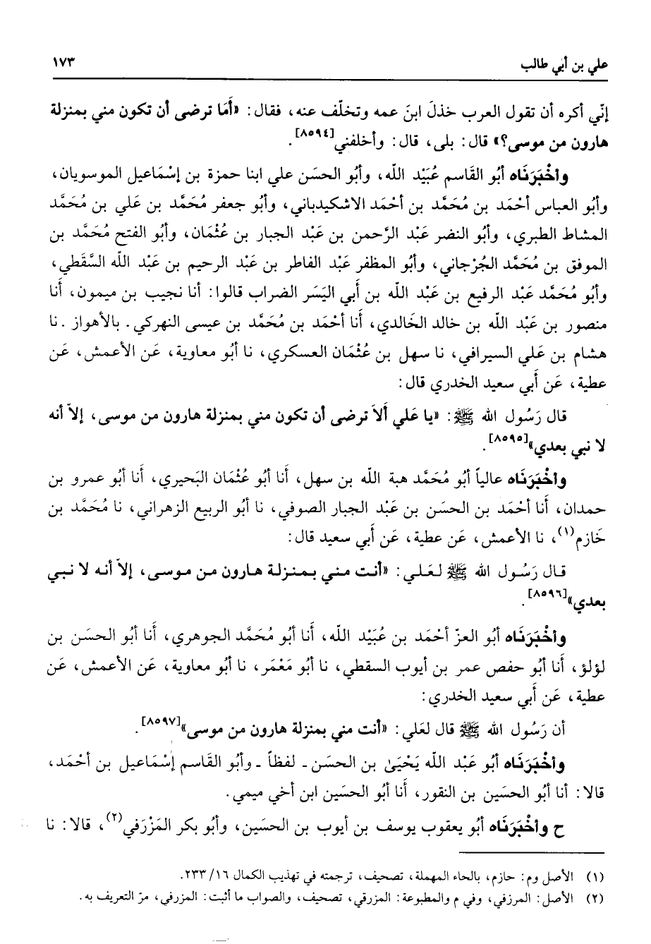 إني أكره أن تقول العرب خذل ابن عمه وتخلف عنه فقال أما ترضى أن تكون مني بمنزلة هارون من موسى قال بلى قال وأخلفني وأخبرناه أبو القاسم عبيد الله وأبو الحسن علي ابنا حمزة بن إسماعيل الموسويان وأبو العباس أحمد بن محمد بن أحمد الاشكيدباني وأبو جعفر محمد بن علي بن محمد المشاط الطبري وأبو النضر عبد الرحمن بن عبد الجبار بن عثمان وأبو الفتح محمد بن الموفق بن محمد الجرجاني وأبو المظفر عبد الفاطر بن عبد الرحيم بن عبد الله السقطي وأبو محمد عبد الرفيع بن عبد الله بن أبي اليسر الضراب قالوا أنا نجيب بن ميمون أنا منصور بن عبد الله بن خالد الخالدي أنا أحمد بن محمد بن عيسى النهركي بالأهواز نا هشام بن علي السيرافي نا سهل بن عثمان العسكري نا أبو معاوية عن الأعمش عن عطية عن أبي سعيد الخدري قال قال رسول الله (صلى الله عليه وسلم) يا علي ألا ترضى أن تكون مني بمنزلة هارون من موسى إلا أنه لا نبي بعدي وأخبرناه عاليا أبو محمد هبة الله بن سهل أنا أبو عثمان البحيري أنا أبو عمرو بن حمدان أنا أحمد بن الحسن بن عبد الجبار الصوفي نا أبو الربيع الزهراني نا محمد بن حازم (1) نا الأعمش عن عطية عن أبي سعيد قال قال رسول الله (صلى الله عليه وسلم) لعلي أنت مني بمنزلة هارون من موسى إلا أنه لا نبي بعدي وأخبرناه أبو العز أحمد بن عبيد الله أنا أبو محمد الجوهري أنا أبو الحسن بن لؤلؤ أنا أبو حفص عمر بن أيوب السقطي نا أبو معمر نا أبو معاوية عن الأعمش عن عطية عن أبي سعيد الخدري أن رسول الله (صلى الله عليه وسلم) قال لعلي أنت مني بمنزلة هارون من موسى وأخبرناه أبو عبد الله يحيى بن الحسن لفظا وأبو القاسم إسماعيل بن أحمد قالا أنا أبو الحسين بن النقور أنا أبو الحسين ابن أخي ميمي ح وأخبرناه أبو يعقوب يوسف بن أيوب بن الحسين وأبو بكر المزرفي (2) قالا نا