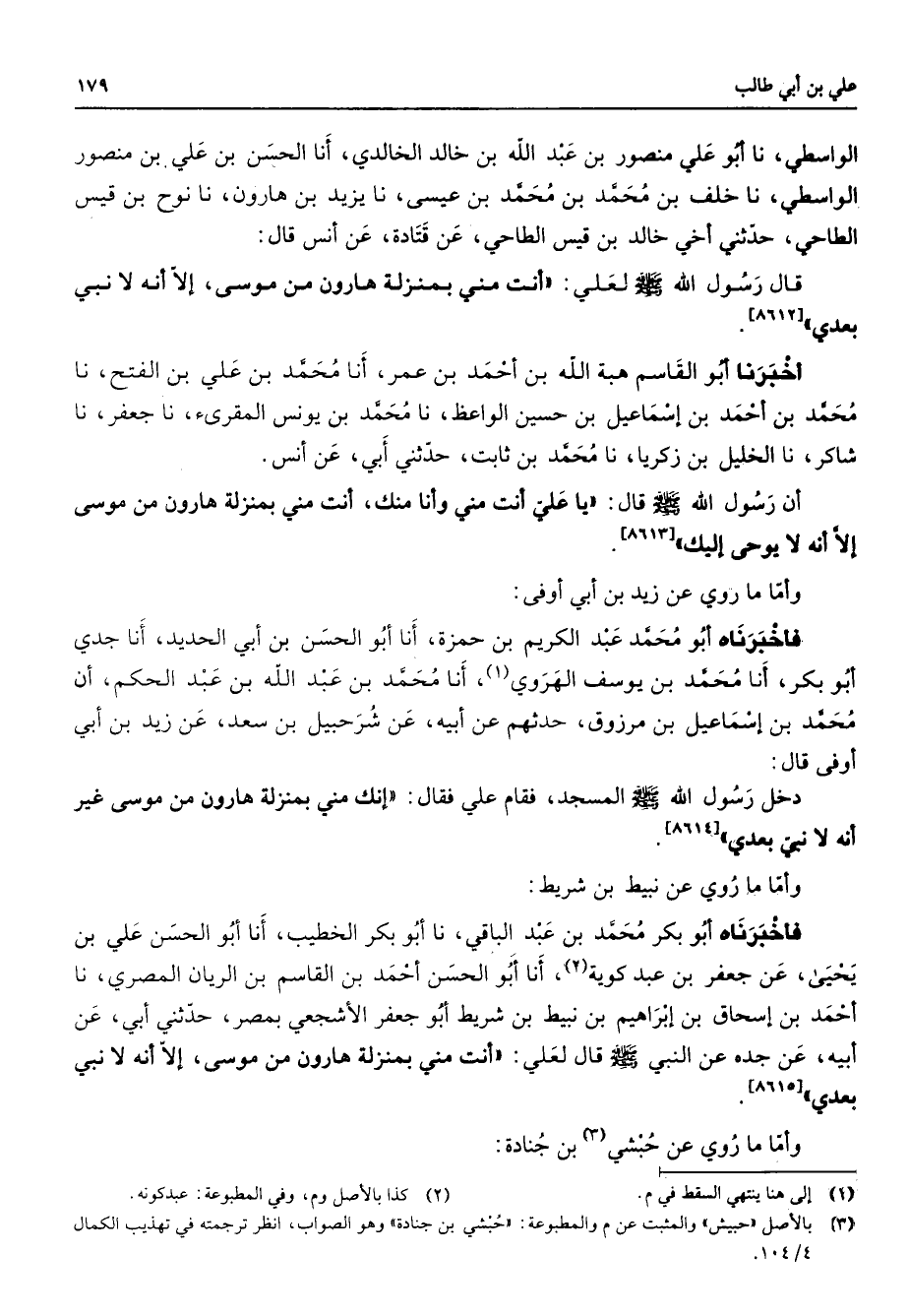 الواسطي نا أبو علي منصور بن عبد الله بن خالد الخالدي أنا الحسن بن علي بن منصور الواسطي نا خلف بن محمد بن محمد بن عيسى نا يزيد بن هارون نا نوح بن قيس الطاحي حدثني أخي خالد بن قيس الطاحي عن قتادة عن أنس قال قال رسول الله (صلى الله عليه وسلم) لعلي أنت مني بمنزلة هارون من موسى إلا أنه لا نبي بعدي أخبرنا أبو القاسم هبة الله بن أحمد بن عمر أنا محمد بن علي بن الفتح نا محمد بن أحمد بن إسماعيل بن حسين الواعظ نا محمد بن يونس المقرئ نا جعفر نا شاكر نا الخليل بن زكريا نا محمد بن ثابت حدثني أبي عن أنس أن رسول الله (صلى الله عليه وسلم) قال يا علي أنت مني وأنا منك أنت مني بمنزلة هارون من موسى إلا أنه لا يوحى إليك وأما ما روي عن زيد بن أبي أوفى فأخبرناه أبو محمد عبد الكريم بن حمزة أنا أبو الحسن بن أبي الحديد أنا جدي أبو بكر أنا محمد بن يوسف الهروي (1) أنا محمد بن عبد الله بن عبد الحكم أن محمد بن إسماعيل بن مرزوق حدثهم عن أبيه عن شرحبيل بن سعد عن زيد بن أبي أوفى قال دخل رسول الله (صلى الله عليه وسلم) المسجد فقام علي فقال أنك مني بمنزلة هارون من موسى غير أنه لا نبي بعدي وأما ما روى عن نبيط بن شريط فأخبرناه أبو بكر محمد بن عبد الباقي نا أبو بكر الخطيب أنا أبو الحسن علي بن يحيى عن جعفر بن عبد كوية (2) أنا أبو الحسن أحمد بن القاسم بن الريان المصري نا أحمد بن إسحاق بن إبراهيم بن نبيط بن شريط أبو جعفر الأشجعي بمصر حدثني أبي عن أبيه عن جده عن النبي (صلى الله عليه وسلم) قال لعلي أنت مني بمنزلة هارون من موسى إلا أنه لا نبي بعدي وأما ما روي عن حبشي (3) بن جنادة