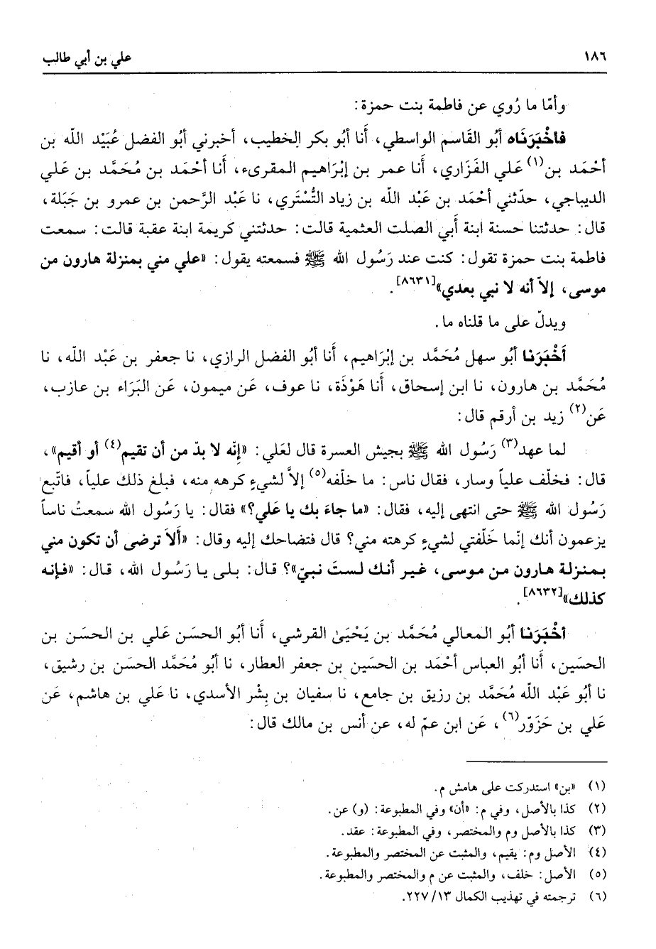 وأما ما روي عن فاطمة بنت حمزة فأخبرناه أبو القاسم الواسطي أنا أبو بكر الخطيب أخبرني أبو الفضل عبيد الله بن أحمد بن (1) علي الفزاري أنا عمر بن إبراهيم المقرئ أنا أحمد بن محمد بن علي الديباجي حدثني أحمد بن عبد الله بن زياد التستري نا عبد الرحمن بن عمرو بن جبلة قال حدثتنا حسنة أبنة أبي الصلت العثمية قالت حدثتني كريمة أبنة عقبة قالت سمعت فاطمة بنت حمزة تقول كنت عند رسول الله (صلى الله عليه وسلم) فسمعته يقول علي مني بمنزلة هارون من موسى إلا أنه لا نبي بعدي ويدل على ما قلناه ما أخبرنا أبو سهل محمد بن إبراهيم أنا أبو الفضل الرازي نا جعفر بن عبد الله نا محمد بن هارون نا ابن إسحاق أناهوذة نا عوف عن ميمون عن البراء بن عازب عن (2) زيد بن أرقم قال لما عهد (3) رسول الله (صلى الله عليه وسلم) بجيش العسرة قال لعلي إنه لابد من أن تقيم (4) أو أقيم قال فخلف عليا وسار فقال ناس ما خلفه (5) إلا لشئ كرهه منه فبلغ ذلك عليا فاتبع رسول الله (صلى الله عليه وسلم) حتى انتهى إليه فقال ما جاء بك يا علي فقال يا رسول الله سمعت ناسا يزعمون أنك إنما (خلفتي) لشئ كرهته مني قال فتضاحك إليه وقال ألا ترضى أن تكون مني بمنزلة هارون من موسى غير أنك لست نبي قال بلى يا رسول الله قال فإنه كذلك أخبرنا أبو المعالي محمد بن يحيى القرشي أنا أبو الحسن علي بن الحسن بن الحسين أنا أبو العباس أحمد بن الحسين بن جعفر العطار نا أبو محمد الحسن بن رشيق نا أبو عبد الله محمد بن زريق بن جامع نا سفيان بن بشر الأسدي ناعلي بن هاشم عن علي بن حزور (6) عن ابن عم له عن أنس بن مالك قال