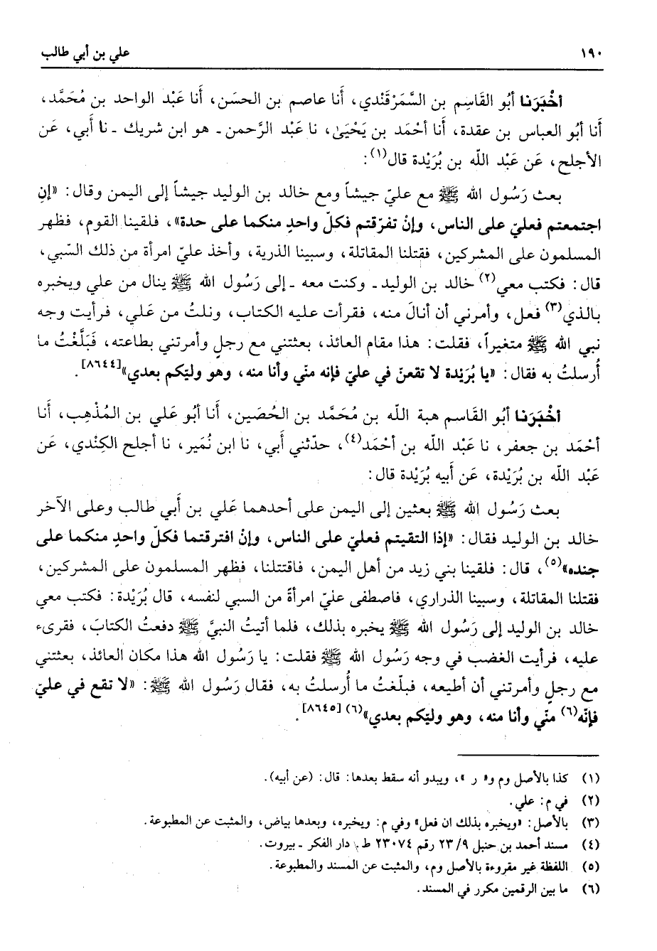 أخبرنا أبو القاسم بن السمرقندي انا عاصم بن الحسن أنا عبد الواحد بن محمد أنا أبو العباس بن عقدة أنا أحمد بن يحيى نا عبد الرحمن هو ابن شريك نا أبي عن الأجلح عن عبد الله بن بريدة قال (1) بعث رسول الله (صلى الله عليه وسلم) مع علي جيشا ومع خالد بن الوليد جيشا إلى اليمن وقال إن اجتمعتم فعلي على الناس وإن تفرقتم فكل واحد منكما على حدة فلقينا القوم فظهر المسلمون على المشركين فقتلنا المقاتلة وسبينا الذرية وأخذ على امرأة من ذلك السبي قال فكتب معي (2) خالد بن الوليد كنت معه إلى رسول الله (صلى الله عليه وسلم) ينال من علي ويخبره بالذي (3) فعل وأمرني أن أنال منه فقرأت عليه الكتاب ونلت من علي فرأيت وجه نبي الله (صلى الله عليه وسلم) متغيرا فقلت هذا مقام العائذ بعثتني مع رجل وأمرتني بطاعته فبلغت ما أرسلت به فقال يا بريدة لا تقعن في علي فإنه مني وأنا منه وهو وليكم بعدي أخبرنا أبو القاسم هبة الله بن محمد بن الحصين أنا أبو علي بن المذهب أنا أحمد بن جعفر نا عبد الله بن أحمد (4) حدثني أبي نا ابن نمير نا أجلح الكندي عن عبد الله بن بريدة عن أبيه بريدة قال بعث رسول الله (صلى الله عليه وسلم) بعثين إلى اليمن على أحدهما علي بن أبي طالب وعلى الاخر خالد بن الوليد فقال إذا التقيتم فعلي على الناس وإن افترقتما فكل واحد منكما على جنده ق (5) قال فلقينا بني زيد من أهل اليمن فاقتتلنا فظهر المسلمون على المشركين فقتلنا المقاتلة وسبينا الذراري فاصطفى علي امرأة من السبي لنفسه قال بريدة فكتب معي خالد بن الوليد إلى رسول الله (صلى الله عليه وسلم) يخبره بذلك فلما أتيت النبي (صلى الله عليه وسلم) دفعت الكتاب فقرئ عليه فرأيت الغضب في وجه رسول الله (صلى الله عليه وسلم) فقلت يا رسول الله هذا مكان العائذ بعثتني مع رجل وأمرتني أن أطيعه فبلغت ما أرسلت به فقال رسول الله (صلى الله عليه وسلم) لا تقع في علي فإنه مني وأنا منه وهو وليكم بعدي (6)
