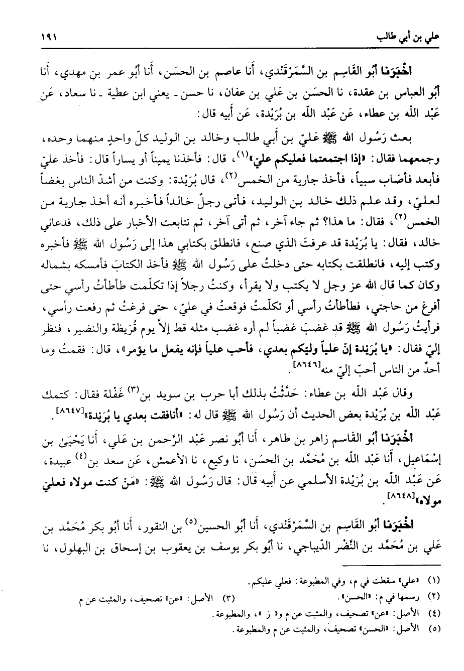 أخبرنا أبو القاسم بن السمرقندي أنا عاصم بن الحسن أنا أبو عمر بن مهدي أنا أبو العباس بن عقدة نا الحسن بن علي بن عفان ن حسن يعني ابن عطية نا سعاد عن عبد الله بن عطاء عن عبد الله بن بريدة عن أبيه قال بعث رسول الله (صلى الله عليه وسلم) علي بن أبي طالب وخالد بن الوليد كل واحد منهما وحده وجمعهما فقال إذا اجتمعتما فعليكم علي (1) قال فأخذنا يمينا أو يسارا قال فأخذ علي فأبعد فأصاب سبيا فأخذ جارية من الخمس (2) قال بريدة وكنت من أشد الناس بغضا لعلي وقد علم ذلك خالد بن الوليد فأتى رجل خالدا فأخبره أنه أخذ جارية من الخمس (2) فقال ما هذا ثم جاء آخر ثم أتى اخر ثم تتابعت الأخبار على ذلك فدعاني خالد فقال يا بريدة قد عرفت الذي صنع فانطلق بكتابي هذا إلى رسول الله (صلى الله عليه وسلم) فأخبره وكتب إليه فانطلقت بكتابه حتى دخلت على رسول الله (صلى الله عليه وسلم) فأخذ الكتاب فأمسكه بشماله وكان كما قال الله عز وجل لا يكتب ولا يقرأ وكنت رجلا إذا تكلمت طأطأت رأسي حتى أفرغ من حاجتي فطأطأت رأسي أو تكلمت فوقعت في علي حتى فرغت ثم رفعت رأسي فرأيت رسول الله (صلى الله عليه وسلم) قد غضب لم أره غضب مثله قط إلا يوم قريظة والنضير فنظر إلي فقال يا بريدة إن عليا وليكم بعدي فأحب عليا فإنه يفعل ما يؤمر قال فقمت وما أحد من الناس أحب إلي منه وقال عبد الله بن عطاء حدثت بذلك أبا حرب بن سويد بن (3) غفلة فقال كتمك عبد الله بن بريدة بعض الحديث أن رسول الله (صلى الله عليه وسلم) قال له أنافقت بعدي يا بريدة أخبرنا أبو القاسم زاهر بن طاهر أنا أبو نصر عبد الرحمن بن علي أنا يحيى بن إسماعيل أنا عبد الله بن محمد بن الحسن نا وكيع نا الأعمش عن سعد بن (4) عبيدة عن عبد الله بن بريدة الأسلمي عن أبيه قال قال رسول الله (صلى الله عليه وسلم) من كنت مولاه فعلي مولاه أخبرنا أبو القاسم بن السمرقندي أنا أبو الحسين (5) بن النقور أنا أبو بكر محمد بن علي بن محمد بن النضر الديباجي نا أبو بكر يوسف بن يعقوب بن إسحاق بن البهلول نا