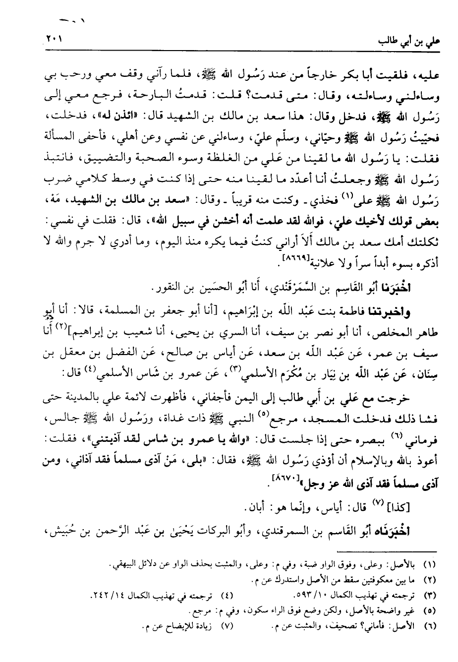 عليه فلقيت أبا بكر خارجا من عند رسول الله (صلى الله عليه وسلم) فلما رأني وقف معي ورحب بي وساءلني وساءلته وقال متى قدمت قلت قدمت البارحة فرجع معي إلى رسول الله (صلى الله عليه وسلم) فدخل وقال هذا سعيد بن مالك بن الشهيد قال ائذن له فجخلت فحييت رسول الله (صلى الله عليه وسلم) وحياني وسلم علي وساءلني عن نفسي وعن أهلي فأحفى المسألة فقلت يا رسول الله (صلى الله عليه وسلم) ما لقينا من علي من الغلظة وسء الصحبة والتضييق فانتبذ رسول الله (صلى الله عليه وسلم) وجعلت أنا أعدد ما لقينا منه حتى إذا كنت في وسط كلامي ضرب رسول الله (صلى الله عليه وسلم) على (1) فخذي وكنت منه قريبا وقال سع بن مالك بن الشهيد مه بعض قولك لأخيك علي فوالله لقد علمت أنه أخشن في سبيل الله قال فقلت في نفسي ثكلتك أمك سعد بن مال ألا أراني كنت فيما يكره منذ اليوم وما أدري لا جرم والله لا أذكره بسوء أبدا سرا ولا علانية أخبرنا أبو القاسم بن السمرقندي أنا أبو الحسين بن النقور وأخبرتنا فاطمة بنت عبد الله بن إبراهيم أنا أبو جعفر بن المسلمة قالا أنا أبو طاهر المخلص أنا أبو نصر بن يوسف انا السري بن يحيى أنا شعيب بن إبراهيم (2) أنا سيف بن عمر عن عبد الله بن سعد عن إياس بن صالح عن الفضل بن معقل بن سنان عن عبد الله بن نيار بن مكرم الأسلمي (3) عن عمرو بن شاس الأسلمي (4) قال خرجت مع علي بن أبي طالب إلى اليمن فأجفاني فأظهرت لائمة علي بالمدينة حتى فشا ذلك فدخلت المسجد مرجع (5) النبي (صلى الله عليه وسلم) ذات غداة ورسول الله (صلى الله عليه وسلم) جالس فرماني (6) ببصره حتى إذا جلست قال والله يا عمرو بن شاس لقد اذيتني فقلت أعوذ بالله وبالإسلام أن أؤذي رسول الله (صلى الله علي وسلم) فقال بلى من اذى مسلما فقد اذاني ومن اذى مسلما فقد اذى الله عز وجل كذا (7) قال أياس وإنما هو أبان أخبرناه أبو القاسم بن السمرقندي وأبو البركات يحيى بن عبد الرحمن بن حبيش