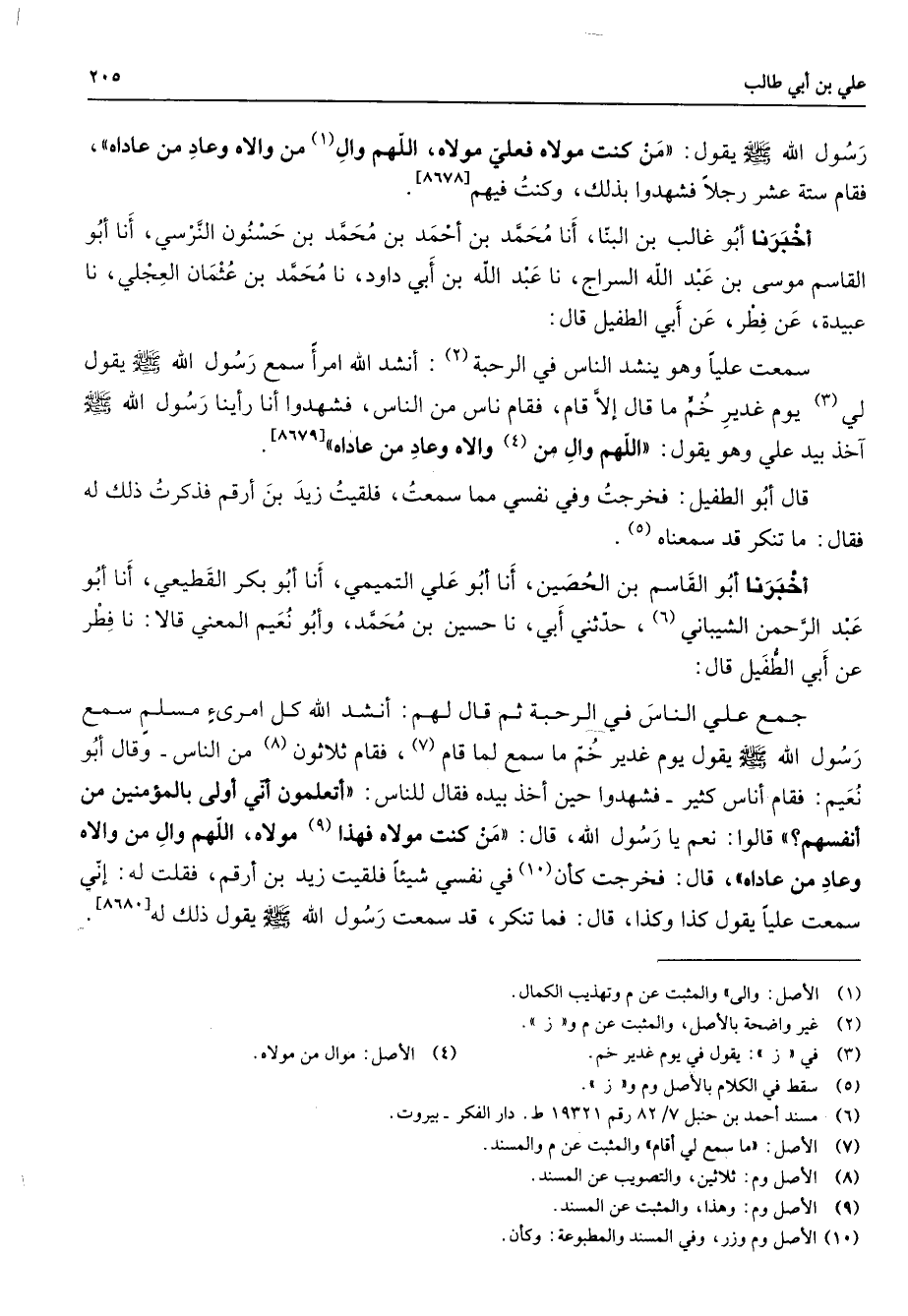 رسول الله (صلى الله عليه وسلم) يقول من كنت مولاه فعلي مولاه اللهم وال (1) من والاه وعاد من عاداه فقام ستة عشر رجلا فشهدوا بذلك وكنت فيهم أخبرنا أبو غالب بن البنا أنا محمد بن أحمد بن محمد بن حسنون النرسي أنا أبو القاسم موسى بن عبد الله السراج نا عبد الله بن أبي داود نا محمد بن عثمان العجلي نا عبيدة عن فطر عن أبي الطفيل قال سمعت عليا وهو ينشد الناس في الرحبة (2) أنشد الله امرأ سمع رسول الله (صلى الله عليه وسلم) يقول لي (3) يوم غدير خم ما قال إلا قام فقام ناس من الناس فشهدوا أنا رأينا رسول الله (صلى الله عليه وسلم) اخذ بيد علي وهو يقول اللهم وال من (4) والاه وعاد من عاداه قال أبو الطفيل فخرجت وفي نفسي مما سمعت فلقيت زيد بن أرقم فذكرت ذلك له فقال ما تنكر قد سمعناه (5) أخبرنا أبو القاسم بن الحصين أنا أبو علي التميمي أنا أبو بكر القطيعي أنا أبو عبد الرحمن الشيباني (6) حدثني أبي نا حسين بن محمد وأبو نعيم المعني قالا نا فطر عن أبي الطفيل قال جمع علي الناس في الرحبة ثم قال لهم أنشد الله كل امرئ مسلم سمع رسول الله (صلى الله عليه وسلم) يقول يوم غدير خم ما سمع لما قام (7) فقام ثلاثون (8) من الناس وقال أبو نعيم فقام أناس كثير فشهدوا حين أخذ بيده فقال للناس أتعلمون أني أولى بالمؤمنين من أنفسهم قالوا نعم يا رسول الله قال من كنت مولاه فهذا (9) مولاه اللهم وال من والاه وعاد من عاداه قال فخرجت كأن (10) في نفسي شيئا فلقيت زيد بن أرقم فقلت له إني سمعت عليا يقول كذا وكذا قال فما تنكر قد سمعت رسول الله (صلى الله عليه وسلم) يقول ذلك له