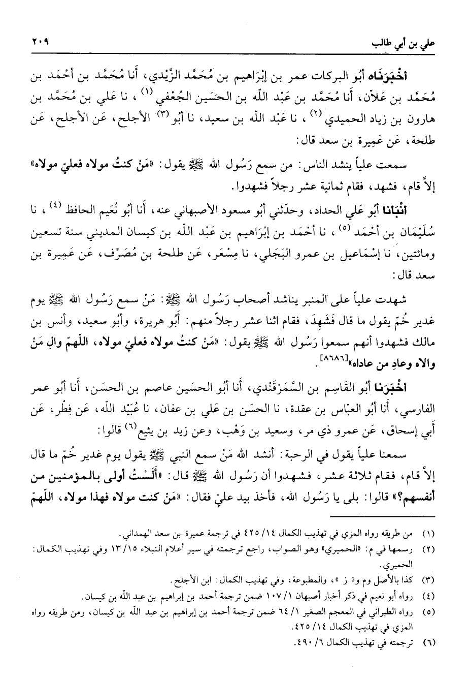 أخبرناه أبو البركات عمربن إبراهيم بن محمد الزيدي أنا محمد بن أحمد بن محمد بن علان أنا محمد بن عبد الله بن الحسين الجعفي (1) ناعلي بن محمد بن هارون بن زياد الحميدي (2) نا عبد الله بن سعيد نا أبو (3) الأجلح عن الأجلح عن طلحة عن عميرة بن سعد قال سمعت عليا ينشد الناس من سمع رسول الله (صلى الله عليه وسلم) يقول من كنت مولاه فعلي مولاه إلا قام فشهد فقام ثمانية عشر رجلا فشهدوا أنبانا أبو علي الحداد وحدثني أبو مسعود الأصبهاني عنه أنا أبو نعيم الحافظ (4) نا سليمان بن أحمد نا أحمد (5) بن إبراهيم بن عبد الله بن كيسان المديني سنة تسعين ومائتين نا إسماعيل بن عمرو البجلي نا مسعر عن طلحة بن مصرف عن عميرة بن سعد قال شهدت عليا على المنبر يناشد أصحاب رسول الله (صلى الله عليه وسلم) من سمع رسول الله (صلى الله عليه وسلم) يوم غدير خم يقول ما قال فشهد فقام اثنا عشر رجلا منهم أبو هريرة وأبو سعيد وأنس بن مالك فشهدوا أنهم سمعوا رسول الله (صلى الله عليه وسلم) يقول من كنت مولاه فعلي مولاه اللهم وال من والاه وعاد من عاداه أخبرنا أبو القاسم بن السمرقندي انا أبو الحسين عاصم بن الحسن أنا أبو عمر الفارسي أنا أبو العباس بن عقدة نا الحسن بن علي بن عفان نا عبيد الله عن فطر عن أبي إسحاق عن عمرو ذي مر وسعيد بن وهب وعن زيد بن يثيع (6) قالوا سمعنا عليا يقول في الرحبة أنشد الله من سمع النبي (صلى الله عليه وسلم) يقول يوم غدير خم ما قال إلا قام فقام ثلاثة عشر فشهدوا أن رسول الله (صلى الله عليه وسلم) قال ألست أولى بالمؤمنين من أنفسهم قالوا بلى يا رسول الله فأخذ بيد علي فقال من كنت مولاه فهذا مولاه اللهم