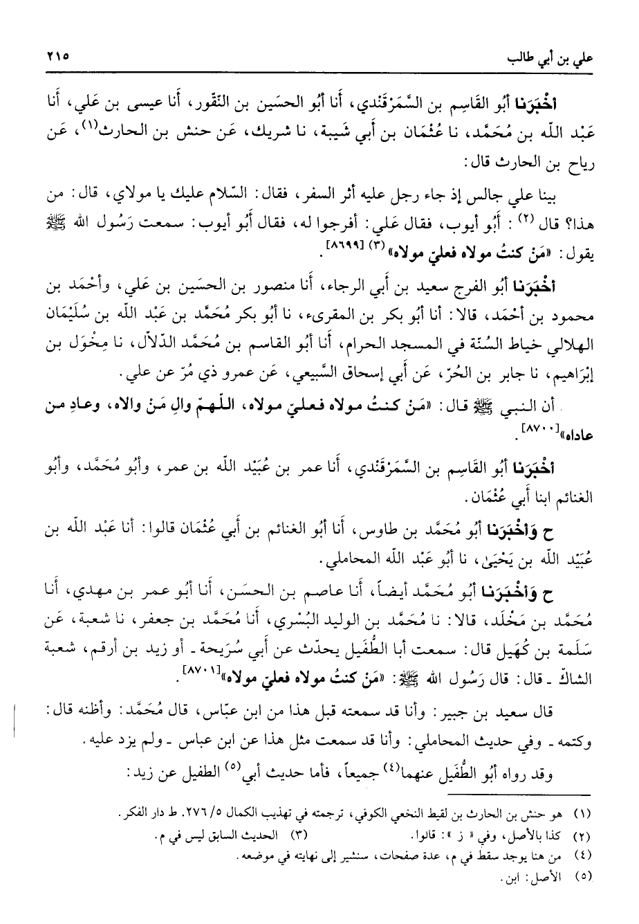أخبرنا أبو القاسم بن السمرقندي انا أبو الحسين بن النقور أنا عيسى بن علي أنا عبد الله بن محمد نا عثمان بن أبي شيبة نا شريك عن حنش بن الحارث (1) عن رياح بن الحارث قال بينا علي جالس إذ جاء رجل عليه أثر السفر فقال السلام عليك يا مولاي قال من هذا قال (2) أبو أيوب فقال علي أفرجوا له فقال أبو أيوب سمعت رسول الله (صلى الله عليه وسلم) يقول من كنت مولاه فعلي مولاه (3) * * *] أخبرنا أبوب الفرج سعيد بن أبي الرجاء أنا منصور بن الحسين بن علي وأحمد بن محمود بن أحمد قالا أنا أبو بكر بن المقرئ نا أبو بكر محمد بن عبد الله بن سليمان الهلالي خياط السنة في المسجد الحرام أنا أبو القاسم بن محمد الدلال نامخول بن إبراهيم نا جابر بن الحر عن أبي أسحاق السبيعي عن عمرو ذي مر عن علي أن النبي (صلى الله عليه وسلم) قال من كنت مولاه فعلي مولاه اللهم وال من والاه وعاد من عاداه أخبرنا أبو القاسم بن السمرقندي أنا عمر بن عبيد الله بن عمر وأبو محمد وأبو الغنائم ابنا أبي عثمان ح وأخبرنا أبو محمد بن طاوس أنا أبو الغنائم بن أبي عثمان قالوا أنا عبد الله بن عبيد الله بن يحيى نا أبو عبد الله المحاملي ح وأخبرنا أبو محمد ايضا أنا عاصم بن الحسن أنا أبو عمر بن مهدي أنا محمد بن مخلد قالا نا محمد بن الوليد البسري أنا محمد بن جعفر نا شعبة عن سلمة بن كهيل قال سمعت أبا الطفيل يحدث عن أبي سريحة أو زيد بن أرقم شعبة الشاك قال قال رسول الله (صلى الله عليه وسلم) من كنت مولاه فعلي مولاه قال سعيد بن جبير وانا قد سمعته قبل هذا من ابن عباس قال محمد وأظنه قال وكتمه وفي حديث المحاملي وأنا قد سمعت مثل هذا عن ابن عباس ولم يزد عليه وقد رواه أبو الطفيل عنهما (4) جميعا فأما حديث (5) أبي الطفيل عن زيد