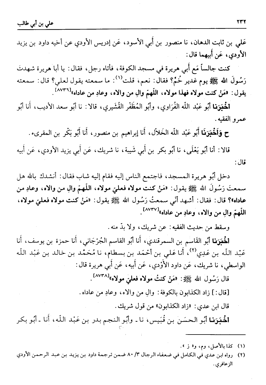 علي بن ثابت الدهان نا منصور بن أبي الأسود عن إدريس الأودي عن أخيه داود بن يزيد الأودي عن أبيهما قال كنت جالسا مع أبي هريرة في مسجد الكوفة فأتاه رجل فقال يا أبا هريرة شهدت رسول الله (صلى الله عليه وسلم) يوم غدير خم فقال نعم قلت (1) ما سمعته يقول لعلي قال سمعته يقول من كنت مولاه فهذا مولاه اللهم وال من والاه وعاد من عاداه أخبرنا أبو عبد الله الفراوي وأبو المظفر القشيري قالا نا أبو سعد الأديب اناأبو عمرو الفقيه ح وأخبرنا أبو عبد الله الخلال أنا إبراهيم بن منصور أنا أبو بكر بن المقرئ قالا أنا أبو يعلى نا أبو بكر بن أبي شيبة نا شريك عن أبي يزيد الأودي عن أبيه قال دخل أبو هريرة المسجد فاجتمع الناس إليه فقام شاب فقال أنشدك بالله هل سمعت رسول الله (صلى الله عليه وسلم) يقول من كنت مولاه فعلي مولاه اللهم وال من والاه وعاد من عاداه قال فقالت أشهد أني سمعت رسول الله (صلى الله عليه وسلم) يقول من كنت مولاه فعلي مولاه اللهم وال من والاهت وعاد من عاداه قال فقال اشهد اني سمعت رسول الله صلى الله عليه وسلم يقول من كنت مولاه فعلي مولاه اللهم وال من والاه وعاد من عاداه وسقط من حديث الفقيه عن شريك ولا بد منه اخبرنا أبو القاسم بن السمرقندي أنا أبو القاسم الجرجاني أنا حمزة بن يوسف أنا عبد الله بن عدي (2) أنا علي بن أحمد بن بسطام نا محمد بن خالد بن عبد الله الواسطي نا شريك عن داود الأودي عن أبيه عن أبي هريرة قال قال رسول الله (صلى الله عليه وسلم) من كنت مولاه فعلي مولاه قال زاد الكذابون بالكوفة وال من والاه وعاد من عاداه قال ابن عدي زاد الكذابون من قول شريك أخبرنا أبو الحسن بن قبيس نا وأبو النجم بدر بن عبد الله أنا أبو بكر