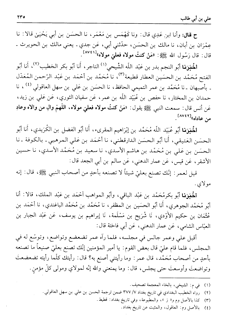 ح قال وأنا ابن عدي قال وناكهمس بن معمر نا الحسن بن أبي يحيى قالا نا عمران بن أبان نا مالك بن الحسن حدثني أبي عن جدي يعني مالك بن الحويرث قال قال رسول الله (صلى الله عليه وسلم) من كنت مولاه فعلي مولاه أخبرنا أبو النجم بدر بن عبد الله الشيحي (1) التاجر أنا أبو بكر الخطيب (2) أنا أبو الفتح محمد بن الحسين العطار قطيعة (3) نا محمد بن أحمد بن عبد الرحمن المعدل بأصبهان نا محمد بن عمر التميمي الحافظ نا الحسن بن علي بن سهل العاقولي (4) نا حمدان بن المختار نا حفص بن عبيد الله بن عمر عن سفيان الثوري عن علي بن زيد عن أنس قال سمعت النبي (صلى الله عليه وسلم) يقول من كنت مولاه فعلي مولاه اللهم وال من والاه وعاد من عاداه أخبرنا أبو عبيد الله محمد بن إبراهيم المقرئ أنا أبو الفضل بن الكريدي أنا أبو الحسن العتيقي أنا أبو الحسن الدارقطني نا أحمد بن علي المرهبي بالكوفة نا الحسن بن علي بن محمد بن هاشم الأسدي نا سعيد بن محمد الأسدي نا حسين الأشقر عن قيس عن عمار الدهني عن سالم بن أبي الجعد قال قيل لعمر إنك تصنع بعلي شيئا لا تصنعه بأحد من أصحاب النبي (صلى الله عليه وسلم) قال إنه مولاي أخبرنا أبو بكر محمد بن عبد الباقي وأبو المواهب أحمد بن عبد الملك قالا أنا أبو محمد الجوهري أنا أبو الحسين بن المظفر نا محمد بن محمد الباغندي نا أحمد بن عثمان بن حكيم الأودي نا شريح بن مسلمة نا إبراهيم بن يوسف عن عبد الجبار بن العباس الشامي عن عمار الدهني عن أبي فاختة قال أقبل علي وعمر جالس في مجلسه فلما راه عمر تضعضع وتواضع وتوسع له في المجلس فلما قام علي قال بعض القوم يا أمير المؤمنين إنك تصنع بعلي صنيعا ما تصنعه بأحد من أصحاب محمد قال عمر وما رأيتني أصنع به قال رأيتك كلما رأيته تضعضعت وتواضعت وأوسعت حتى يجلس قال وما يمنعني والله إنه لمولاي ومولى كل مؤمن