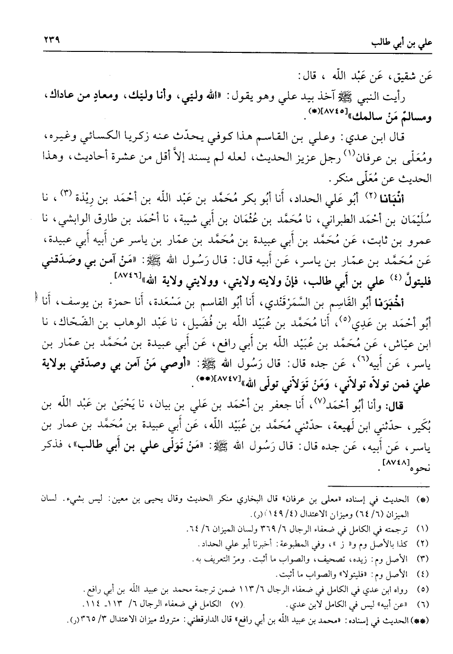 عن شقيق عن عبد الله قال رأيت النبي (صلى الله عليه وسلم) اخذ بيد علي وهو يقول الله وليي وأنا وليك ومعاد من عاداك ومسالم من سالمك قال ابن عدي وعلي بن القاسم هذا كوفي يحدث عنه زكريا الكسائي وغيره ومعلى بن عرفان (1) رجل عزيز الحديث لعله لم يسند إلا أقل من عشرة أحاديث وهذا الحديث عن معلى منكر أنبانا (2) أبو علي الحداد أنا أبو بكر محمد بن عبد الله بن أحمد بن ريذة (3) نا سليمان بن أحمد الطبراني نا محمد بن عثمان بن أبي شيبة نا أحمد بن طارق الوابشي نا عمرو بن ثابت عن محمد بن أبي عبيدة بن محمد بن عمار بن ياسر عن أبيه أبي عبيدة عن محمد بن عمار بن ياسر عن أبيه قال قال رسول الله (صلى الله عليه وسلم) من امن بي وصدقني فليتول (4) على بن أبي طالب فإن ولايته ولايتي وولايتي ولاية الله أخبرنا أبو القاسم بن السمرقندي أنا أبو القاسم بن مسعدة أنا حمزة بن يوسف أنا أبو أحمد بن عدي (5) أنا محمد بن عبيد الله بن فضيل نا عبد الوهاب بن الضحاك نا ابن عياش عن محمد بن عبيد الله بن أبي رافع عن أبي عبيدة بن محمد بن عمار بن ياسر عن أبيه (6) عن جده قال قال رسول الله (صلى الله عليه وسلم) أوصي من امن بي وصدقني بولاية علي فمن تولاه تولاني ومن تولاني تولى الله قال وأنا أبو أحمد (7) أنا جعفر بن أحمد بن علي بن بيان نا يحيى بن عبد الله بن بكير حدثني ابن لهيعة حدثني محمد بن عبيد الله عن أبي عبيدة بن محمد بن عمار بن ياسر عن أبيه عن جده قال قال رسول الله (صلى الله عليه وسلم) من تولى علي بن أبي طالب فذكر نحوه