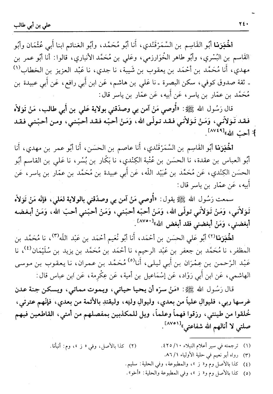أخبرنا أبو القاسم بن السمرقندي أنا أبو محمد وأبو الغنائم ابنا أبي عثمان وأبو القاسم بن البسري وأبو طاهر الخوارزمي وعلي بن محمد الأنباري قالوا أنا أبو عمر بن مهدي أنا محمد بن أحمد بن يعقوب بن شيبة نا جدي نا عبد العزيز بن الخطاب (1) ثقة صدوق كوفي سكن البصرة ناعلي بن هاشم عن ابن أبي رافع عن أبي عبيدة بن محمد بن عمار بن ياسر عن أبيه عن عمار بن ياسر قال قال رسول الله (صلى الله عليه وسلم) أوصي من امن بي وصدقني بولاية علي بن أبي طالب من تولاه فقد تولاني ومن تولاني فقد تولى الله ومن أحبه فقد أحبني ومن أحبني فقد أحب الله أخبرنا أبو القاسم بن السمرقندي أنا عاصم بن الحسن أنا أبو عمر بن مهدي أنا أبو العباس بن عقدة نا الحسن بن عتبة الكندي نا بكار بن بسر نا علي بن القاسم أبو الحسن الكندي عن محمد بن عبيد الله عن أبي عبيدة بن محمد بن عمار بن ياسر عن أبيه عن عمار بن ياسر قال سمعت رسول الله (صلى الله عليه وسلم) يقول أوصي من امن بي وصدقني بالولاية لعلي فإنه من تولاه تولاني ومن تولاني تولى الله ومن أحبه أحبني ومن أحبني أحب الله ومن أبغضه أبغضني ومن أبغضني فقد أبغض الله اخبرنا (2) أبو علي الحسن بن أحمد أنا أبو نعيم أحمد بن عبد الله (3) نا محمد بن المظفر نا محمد بن جعفر بن عبد الرحيم نا أحمد بن محمد بن يزيد بن سليمان (4) نا عبد الرحمن بن عمران بن أبي ليلى أنا (5) محمد بن عمران نا يعقوب بن موسى الهاسمي عن ابن أبي رواد عن إسماعيل بن أمية عن عكرمة عن ابن عباس قال قال رسول الله (صلى الله عليه وسلم) من سره أن يحيا حياتي ويموت مماتي ويسكن جنة عدن غرسها ربي فليوال عليا من بعدي وليوال وليه وليقتد بالأئمة من بعدي فإنهم عترتي خلقوا من طينتي رزقوا فهما وعلما ويل للمكذبين بمفصلهم من أمتي القاطعين فيهم صلتي لا أنالهم الله شفاعتي